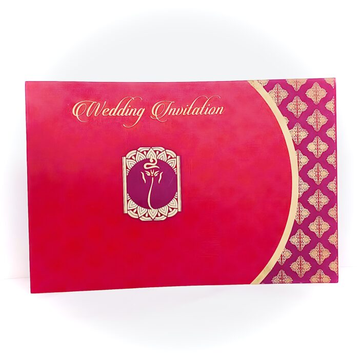 Attractive Maroon Invitation is one of our elegant designs. This invitation card is made out of maroon textured metallic board with matching mailing envelope. Card front has a watermark design and ganesh logo (Please note, this logo can be changed to any symbol or couple initial as per your preference). Please choose one of the colours from our colour pallet (please check the image) for envelopes. 120gsm shimmer paper. The card has two inserts with coordinated printed designs.