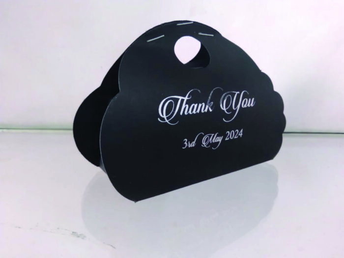 Black butterfly cake box is one of the cutest  that we product. This cake box is made out of balck textured paperboard. Cake box front has a line embossed and silver ink screen print.