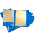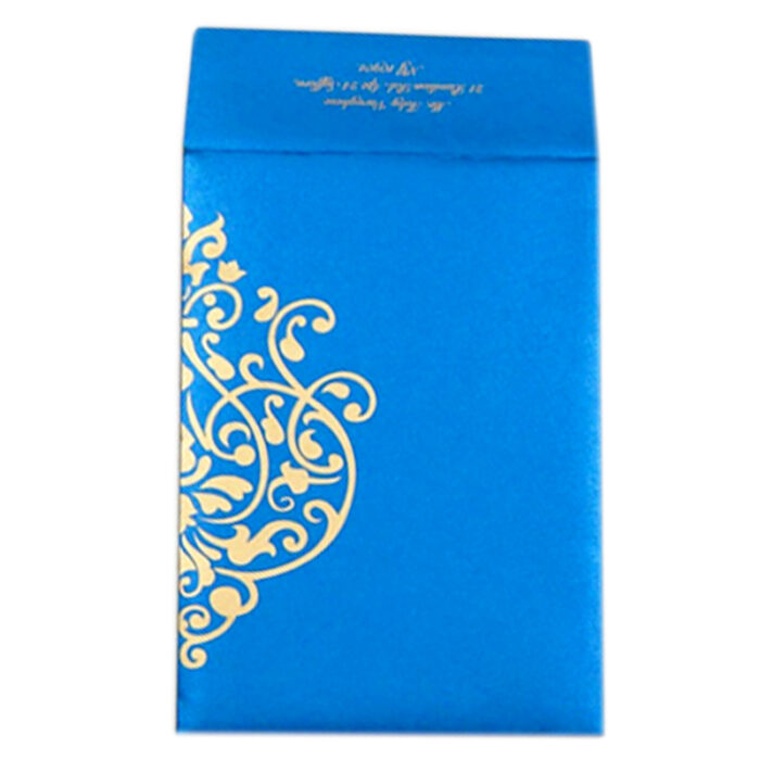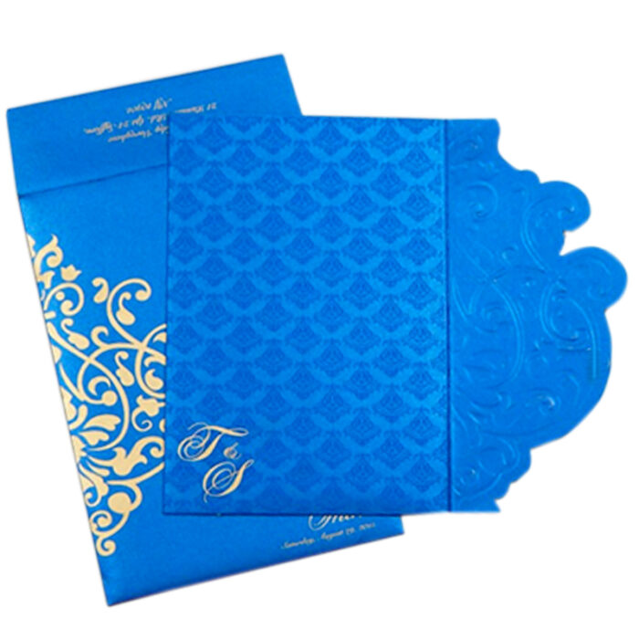 This is a beautiful Blue wonder metallic card finish card with swril designed foiled in bright gold. Brocade lantens and background brocade watermark type printing is unbelievably modern. Ideal for your function which suits with your theme and taste. Card comes with two inserts and envelope. Additional inserts can be ordered separately. Names or initials can be printed on the card front.