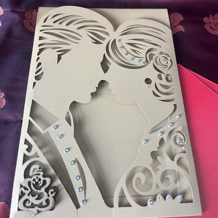 Couple laser cut wedding invitation is one of our elegant design. This invitation card is made out of gold textured paperboard with matching mailing envelope. Card front has a couple laser cut. The card has  inserts with ink printed design. (Please note, this logo can be changed to any symbol or couple initial as per your preference). Please choose one of the colours from our colour pallet (please check the image) for envelopes. 120gsm shimmer paper. The card has two inserts with coordinated printed designs.