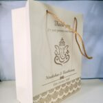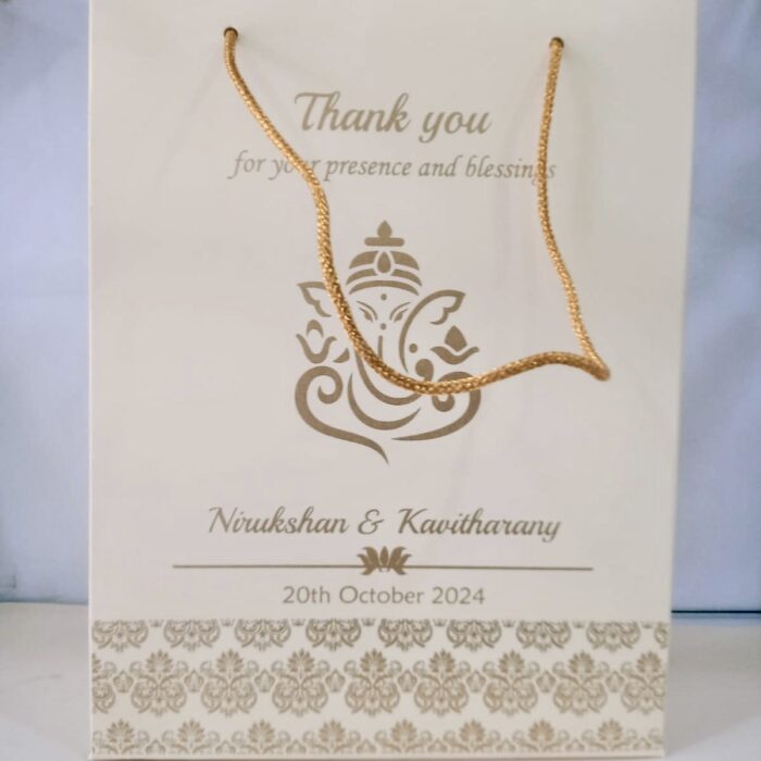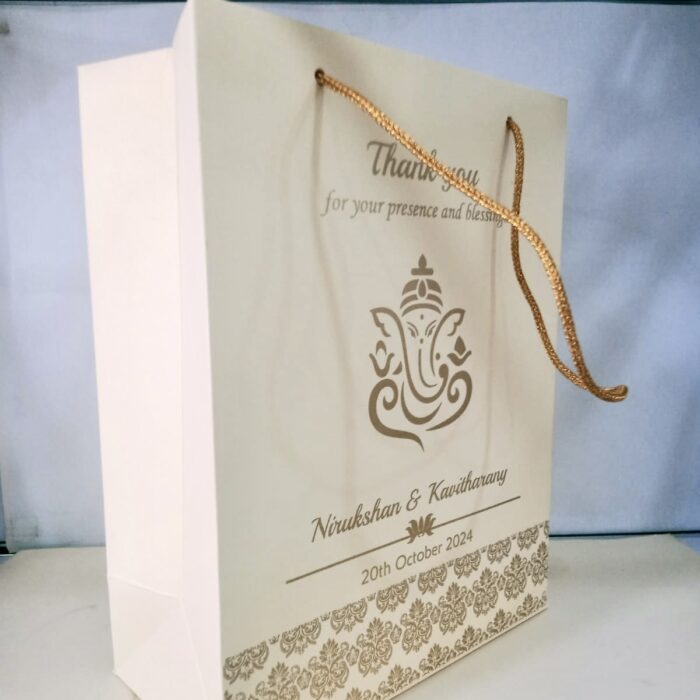 Cream colour gift bag – Cream colour gift bag is one of our beautiful designs. These beautiful personalized gift bags are crafted out of very fine quality Cream  metallic card stock,with gold rope used as handles.Text and design printed on the bag is totally customizable.The printing on this bag is Gold ink.
