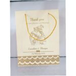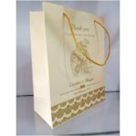 Cream colour gold ink bag – Cream colour gold ink bag is one of our beautiful designs. These beautiful personalized gift bags are crafted out of very fine quality Cream  metallic card stock, with gold rope used as handles. Text and design printed on the bag is totally customizable. The printing on this bag is Gold ink.