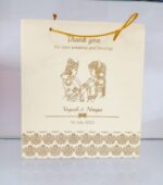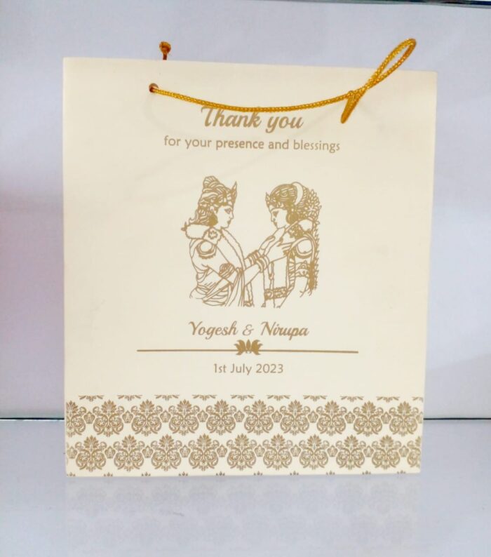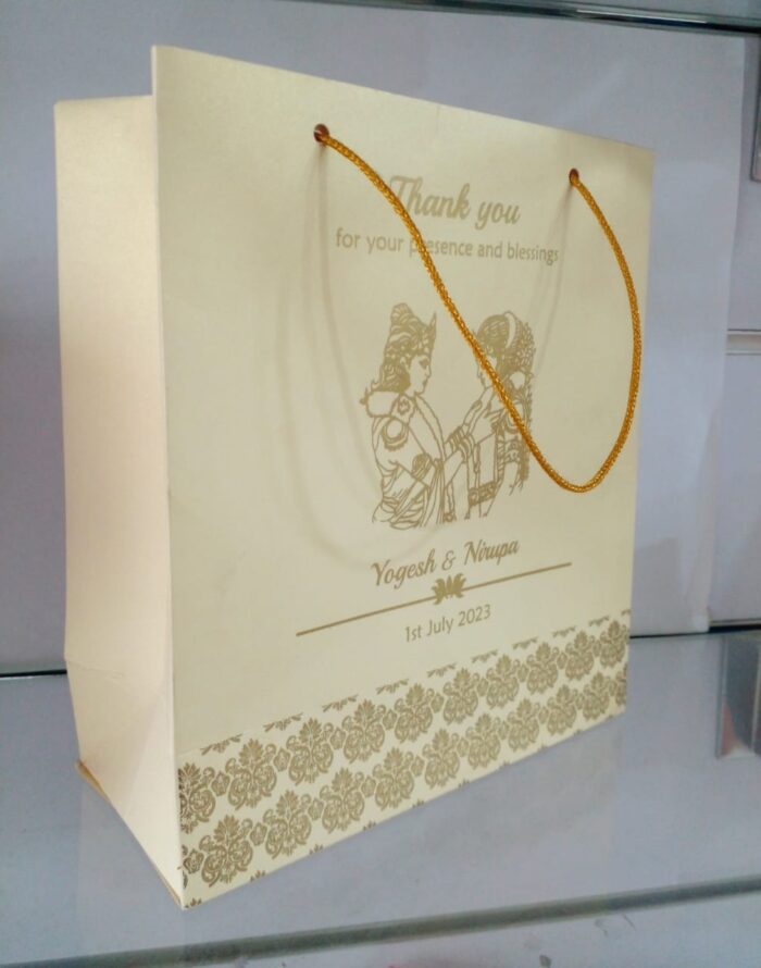 Cream colour gold ink bag – Cream colour gold ink bag is one of our beautiful designs. These beautiful personalized gift bags are crafted out of very fine quality Cream metallic card stock, with gold rope used as handles. Text and design printed on the bag is totally customizable. The printing on this bag is Gold ink. Hence the price reflects the luxury finishing. Minimum Order Quantity:100