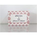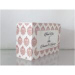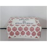 Damask Design Top and bottom cake box is one of our beautiful designs. This cake box is made out of white  textured paperboard.  Cake box top front has a Brown ink screen printing.
