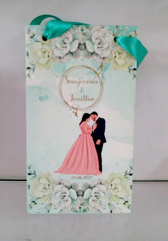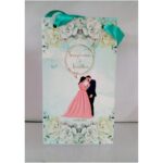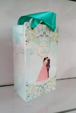 Digital colourful couple logo bag – Digital gift bag is one of our beautiful designs.These beautiful personalized gift bags are crafted out of very fine quality mat board stock,with Green rope used as handles.Text and design printed on the bag is totally customizable.The printing on this bag is Gold ink. Hence the price reflects the luxury finishing.Minimum Order Quantity:100