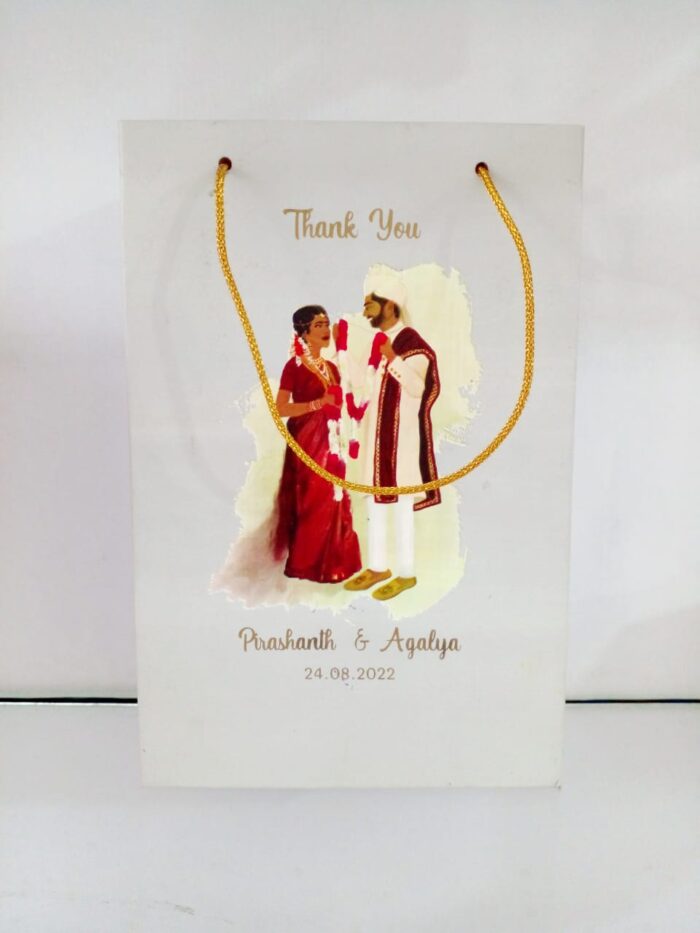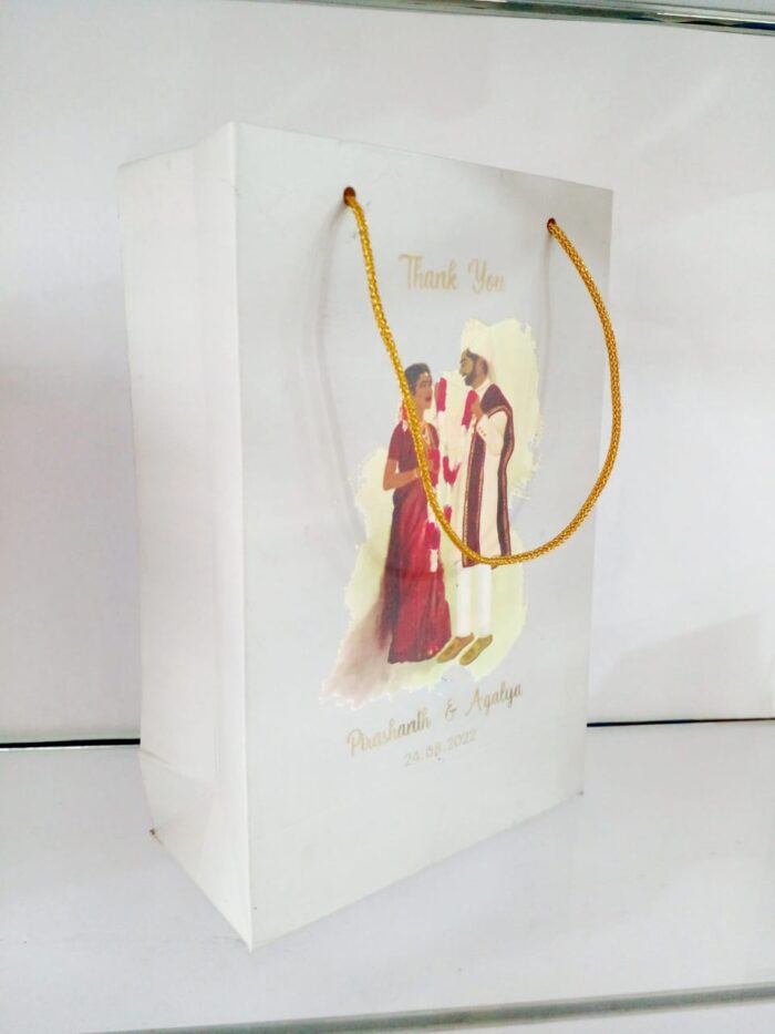 Digital couple logo bag – Digital gift bag is one of our beautiful designs. These beautiful personalized gift bags are crafted out of very fine quality metallic card stock,with gold rope used as handles.Text and design printed on the bag is totally customizable.The printing on this bag is Gold ink.Hence the price reflects the luxury finishing. Minimum Order Quantity:100