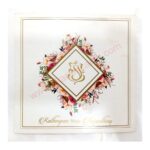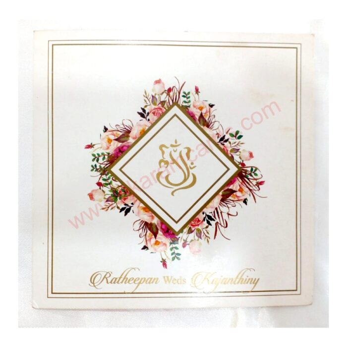 Digital multiple flower design Invitation.This invitation card is made out of white textured paperboard with matching mailing envelope.Card front has a floral design printe and 3D design Ganash logo(Please note, this logo can be changed to any symbol or couple initial as per your preference).Please choose one of the colour from our colours pallet (please check the image) for envelopes.120gsm shimmer paper. The card has two inserts with coordinated printed designs.