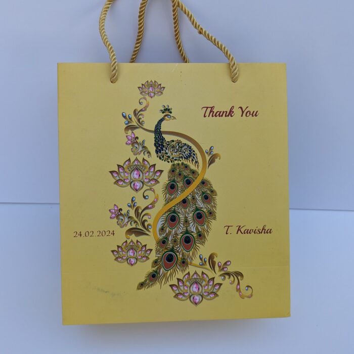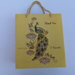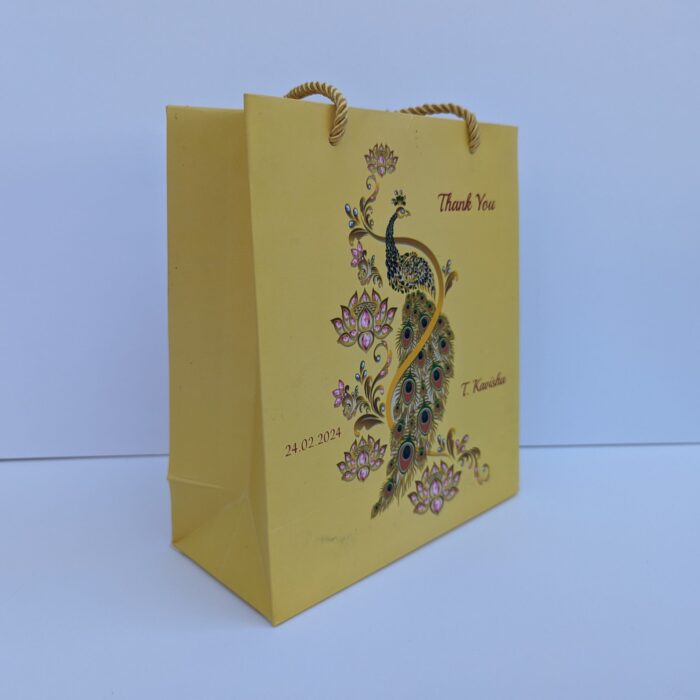Digital peacock design gift bag –Digital peacock design bag is one of our beautiful designs. These beautiful personalized gift bags are crafted out of very fine quality metallic card stock, with gold rope used as handles. Text and design printed on the bag is totally customizable. The printing on this bag is digital designs. Hence the price reflects the luxury finishing. Minimum Order Quantity:100