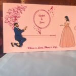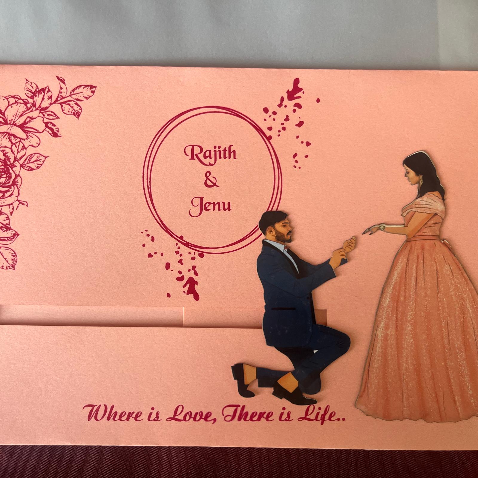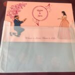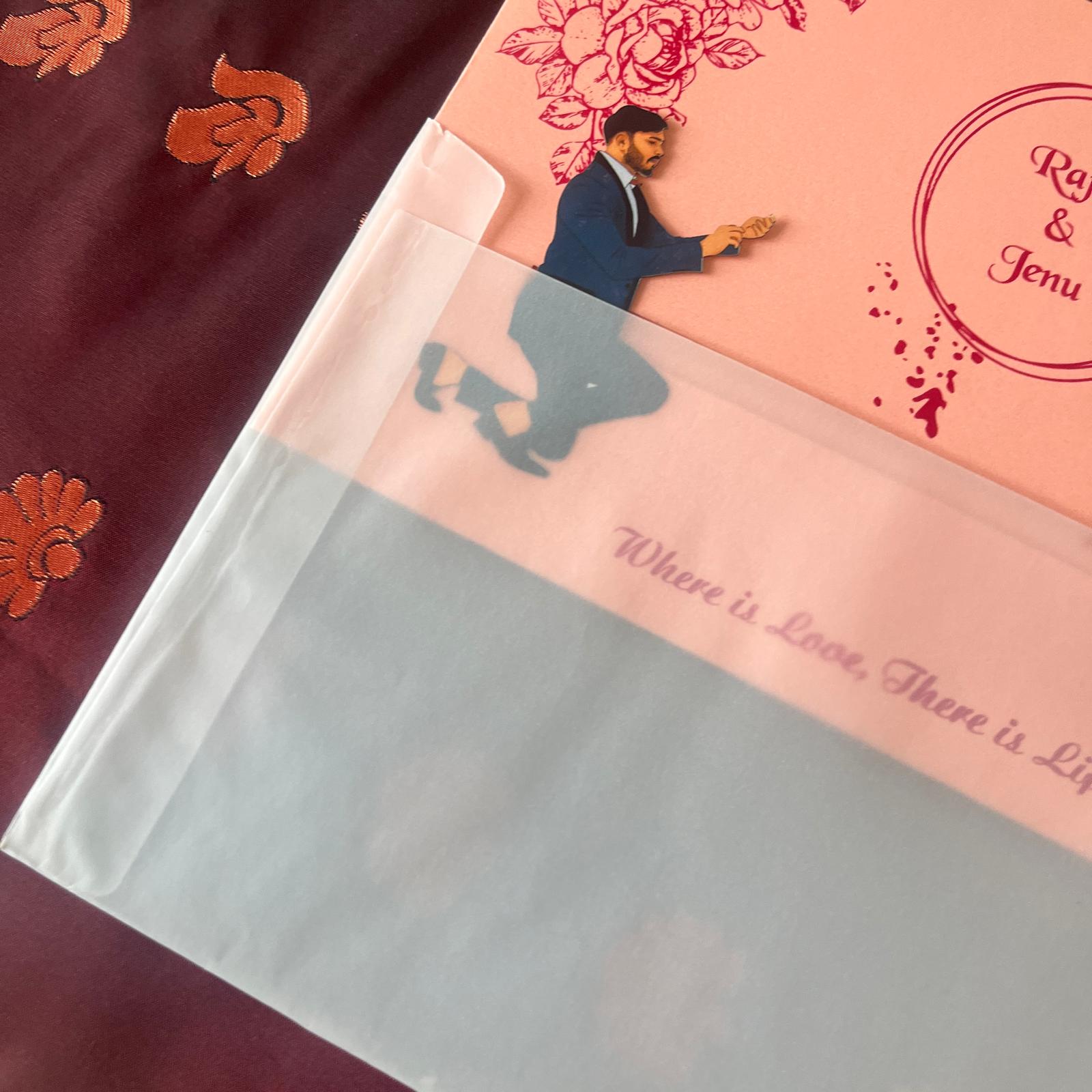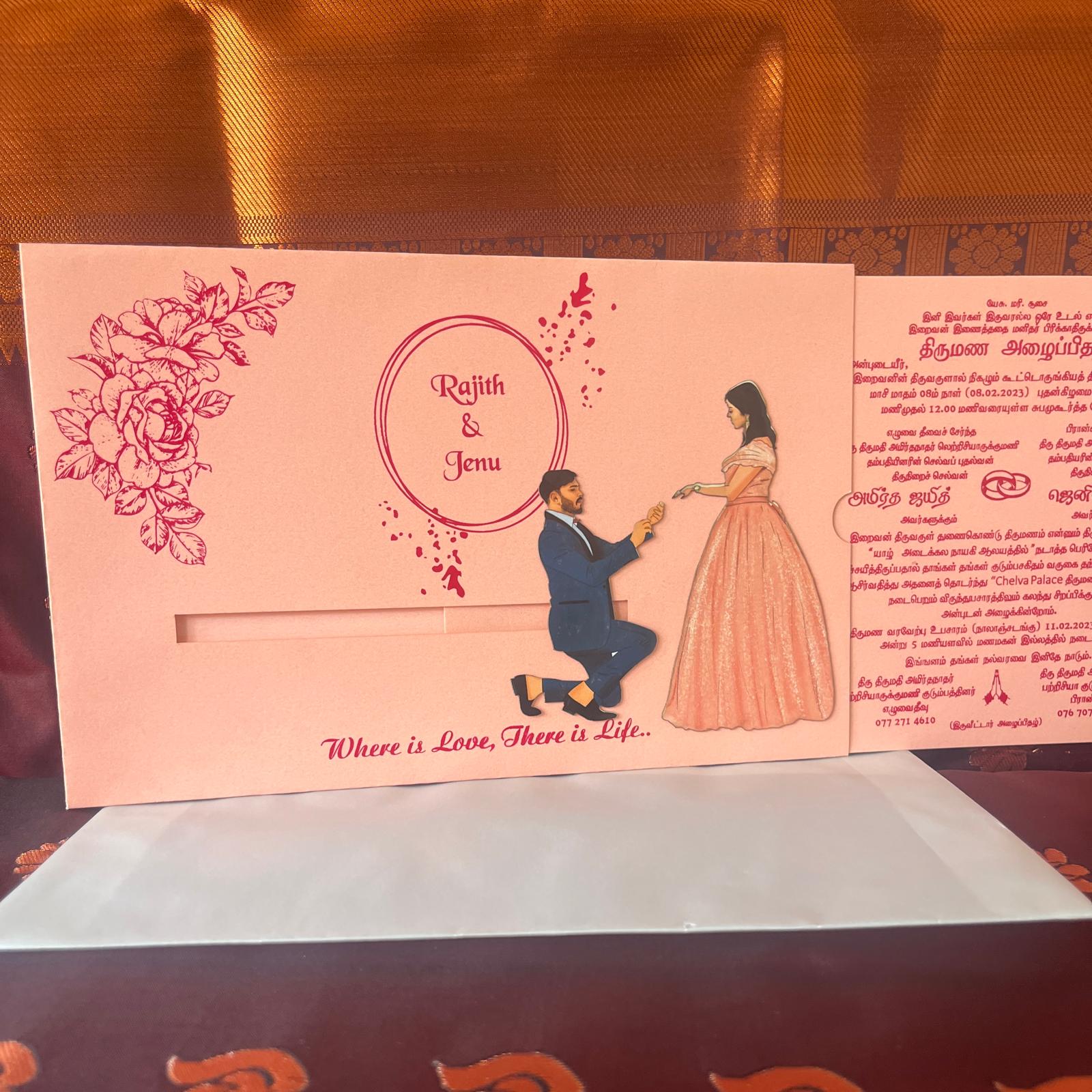 Digital sliding design invitation is one of our elegant designs. This invitation card is made out of Digital printing card with matching mailing envelope. Card front has laser cut Couple photo and Pink Screen printing. (Please note, this logo can be changed to any symbol or couple initial as per your preference). Insert too have silk screen ground borders in different colour option. Envelope is made out of ivory (cream). Please choose one of the colour from our colours pallet (please check the image) for envelopes.