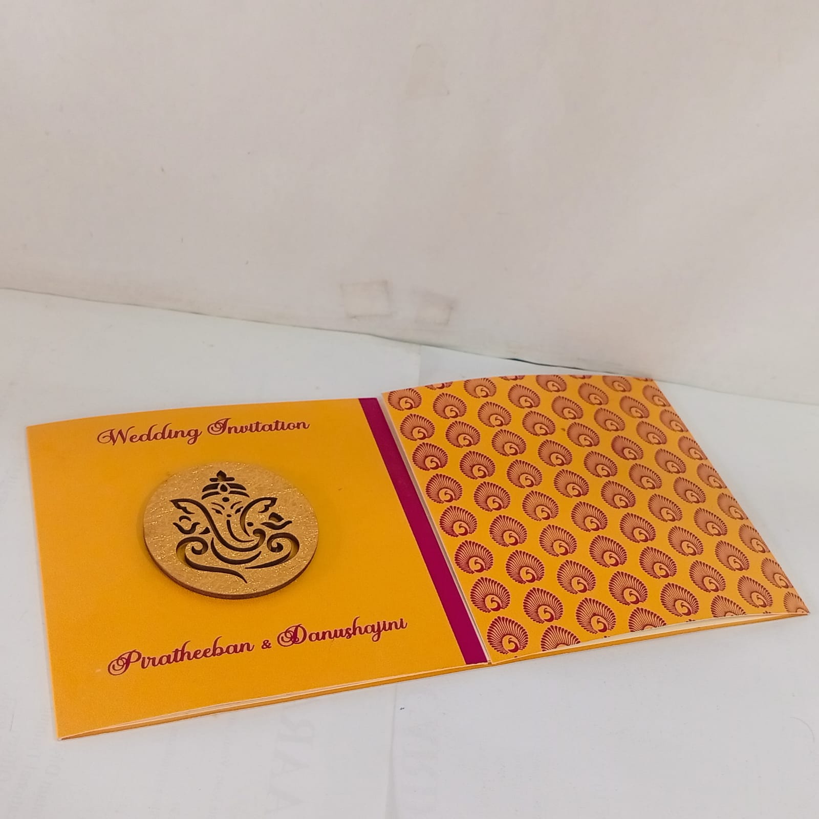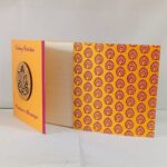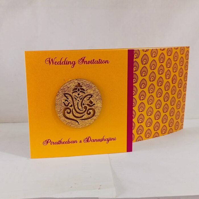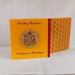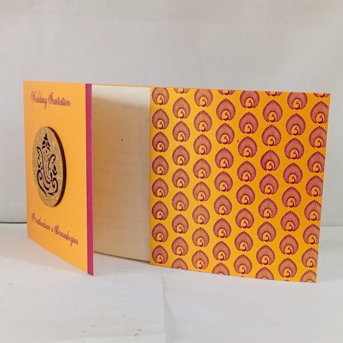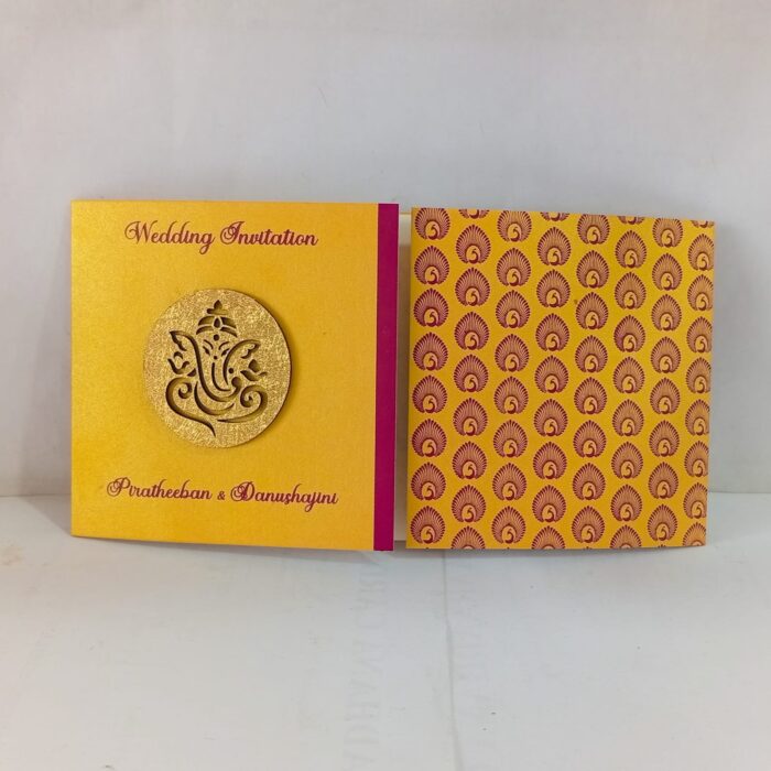 Yellow and Red Door open small Invitation is one of our elegant design. This invitation card is made out of Yellow textured paperboard with matching mailing envelope. Card has a Red watermark design and 3D Ganesh logo Red ink screen print. (Please note, this logo can be changed to any symbol or couple initial as per your preference). Please choose one of the colour from our colours pallet (please check the image) for envelopes. 120gsm shimmer paper.