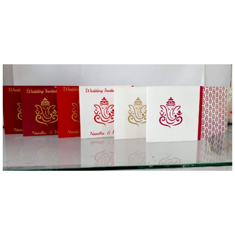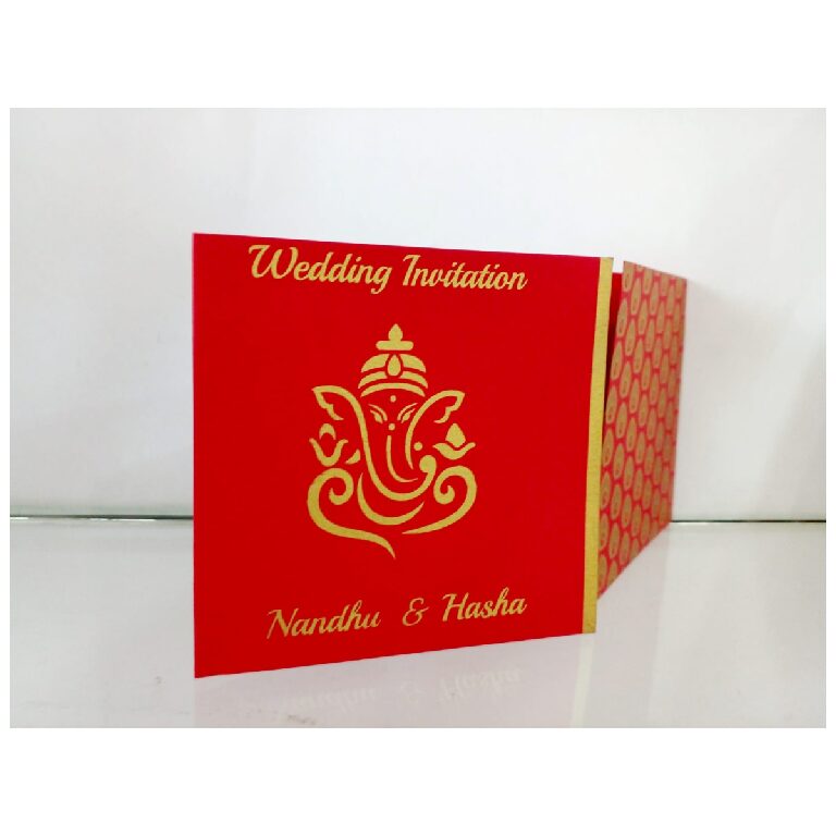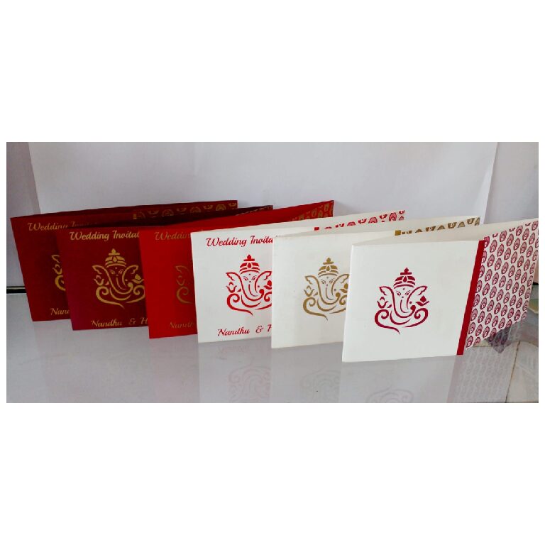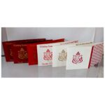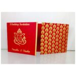 Yellow and Red Door open small Invitation is one of our elegant designs. This invitation card is made out of White textured paperboard with matching mailing envelope. Card has a Red watermark design and 3D Ganesh logo Red ink screen print. (Please note, this logo can be changed to any symbol or couple initial as per your preference). Please choose one of the colour from our colours pallet (please check the image) for envelopes. 120gsm shimmer paper.