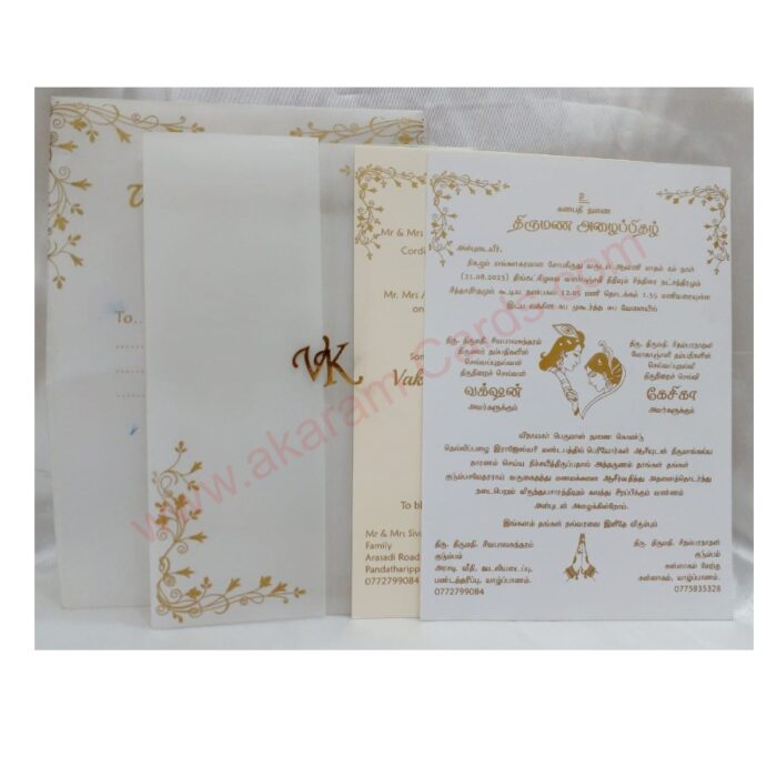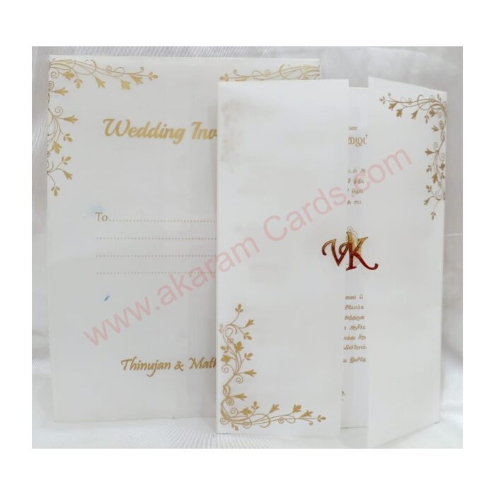 White door open wedding card Invitation is one of our creative design.This invitation card is made out of white textured tracing sheet with matching mailing envelope.Card front has a couple initial laser cut In the opening space pasting.The card has two inserts with coordinated printed design. Please choose one of the colour from our colours pallet (please check the image) for envelopes. 120gsm shimmer paper.