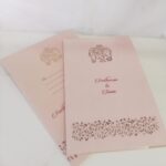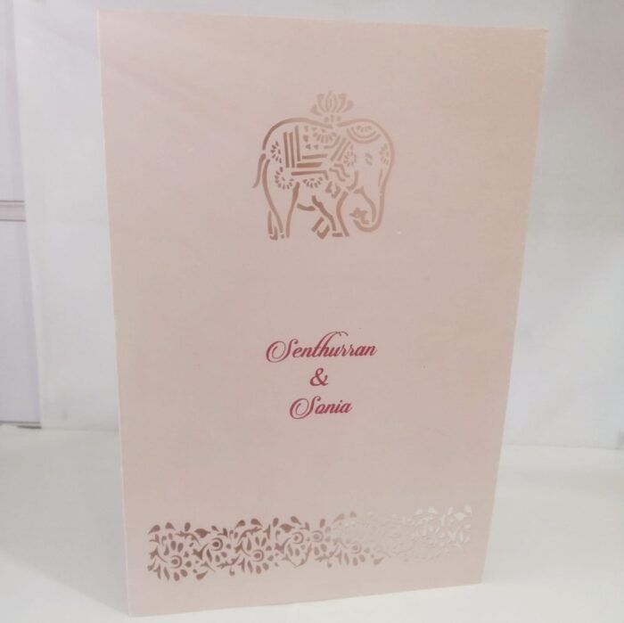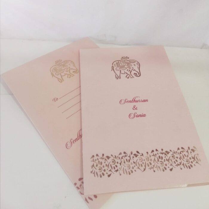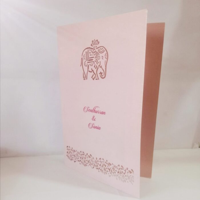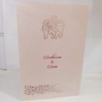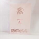 Elephant design laser cut wedding invitation is one of our creative designs. This invitation card is made out of pink textured paperboard with matching mailing envelope. Card front has a  elephant and flower bud laser cut. (Please note, this logo can be changed to any symbol or couple initial as per your preference). The card has two colour inserts with coordinated printed designs.