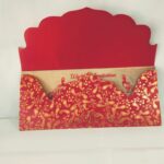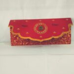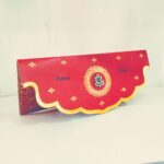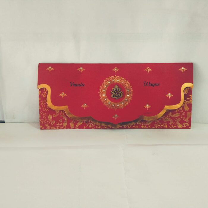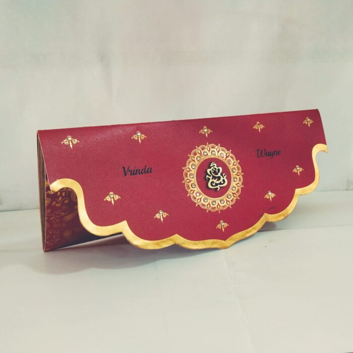 This is a very grand traditional card, two rich colour combination with stones pasting. Sparkling glitter finish in the middle with ganesh sticker of your choice. Excellent match for a grand opening of your dream day.