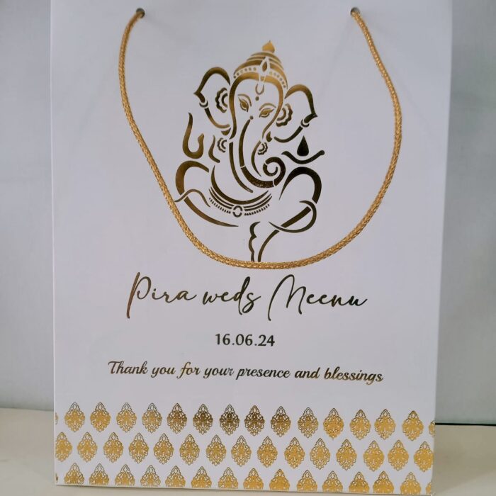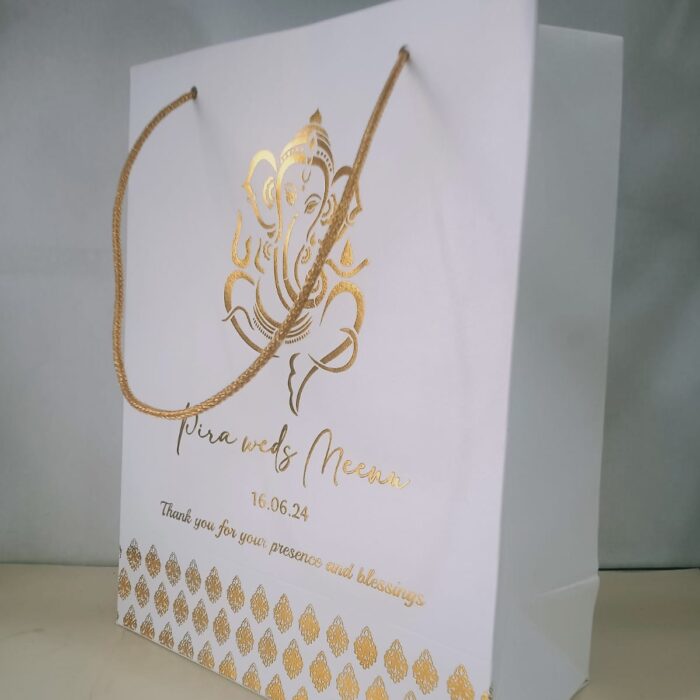 Foil block gift bag new-Foil block Gift bag is one of our beautiful designs. These beautiful personalized gift bags are crafted out of very fine quality metallic card stock, with gold rope used as handles. Text and design printed on the bag is totally customizable. The printing on this bag is Gold foiling. Hence the price reflects the luxury finishing. Minimum Order Quantity:100