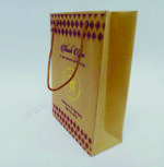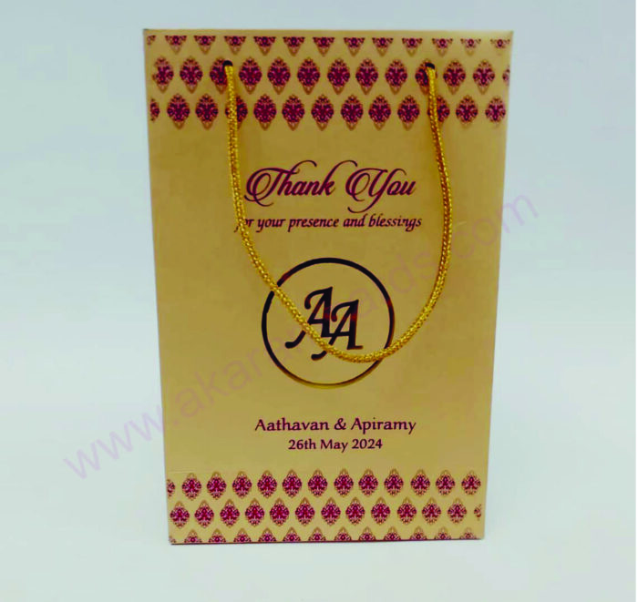 Gold colour Gift bag – Gold colour gift bag is one of our beautiful design. These beautiful personalized gift bags are crafted out of very fine quality mat board stock, with gold rope used as handles. Text and design printed on the bag is totally customizable. The printing on this bag is maroon ink. Initial bag is Gold foiling. Hence the price reflects the luxury finishing.