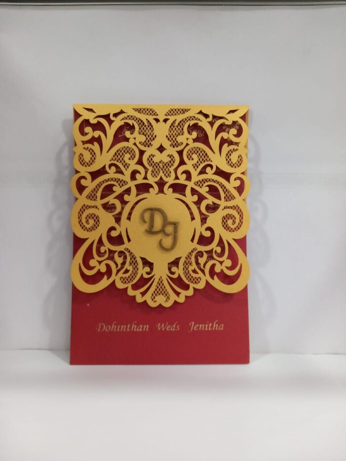 Laser cut Red and yellow paisley wedding invitation is one of our elegant designs. A unique laser cut invitation made from metalic thick brown paper.A tree is laser cut on the cover.The names of the bride and groom,the wedding date,Initials,etc.Are visible through the cuts in the cover.Insert and envelope colours can be changed.The outer card colour also can be changed,with laser cut 3D Ganesh logo(Please note,this logo can be changed to any symbol or couple initial as per your preference).Please choose one of the colour from our colours pallet(please check the image) for envelopes.120gsm shimmer paper.