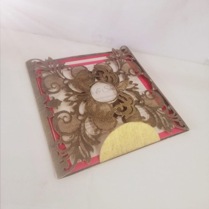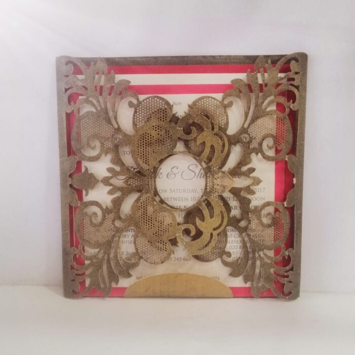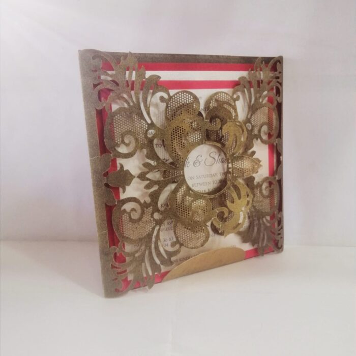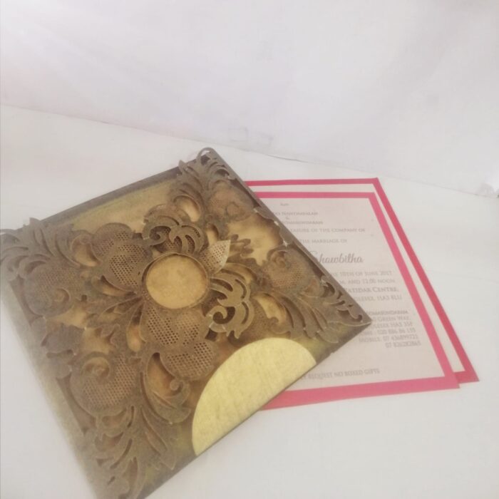 Golden-laser is one of the most famous cards among people.It is a laser-cut type with a designed band in the middle. It is made by using a Metallic board. The attractive gold color suits a traditional auspicious start of your function.