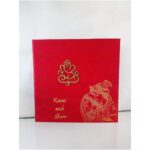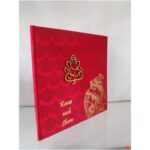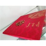 Gorgeous maroon satin wedding invitation is one of our elegant design.This invitation card is made out of maroon textured paperboard with matching mailing envelope.Card has damask water mark design printed on satin with foiled Rathe Krishna, couple name and a ganesh laser cut logo(Please note, this logo can be changed to any symbol or couple initial as per your preference).Please choose one of the colour from our colours pallet(please check the image)for envelopes.250gsm shimmer paper.The card has two inserts with coordinated printed design.