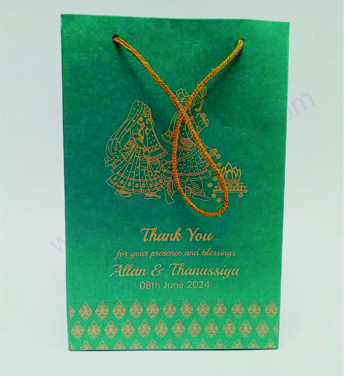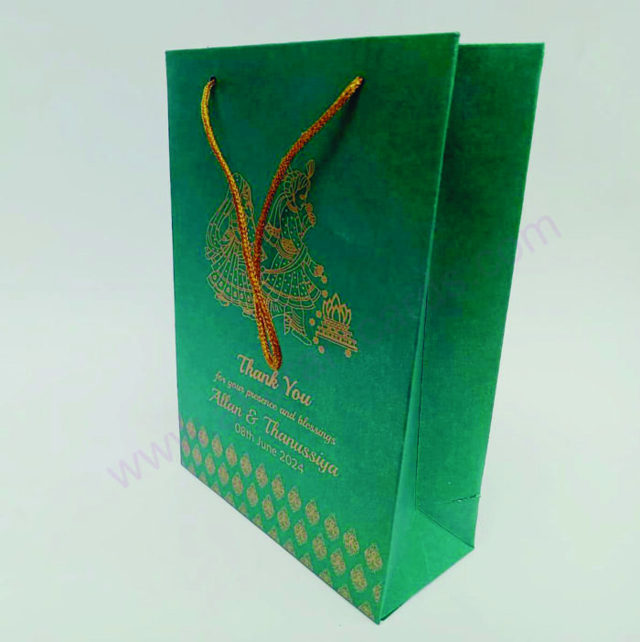 Green Colour bag   – Green colour bag  is one of our beautiful design.These beautiful personalized gift bags are crafted out of very fine quality metallic card stock,with gold rope used as handles.Text and design printed on the bag is totally customizable.The printing on this bag is gold ink.Hence the price reflects the luxury finishing.