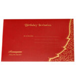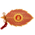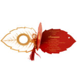 This card is a cut work model which is in shapes of a leaf. The two inserts are made of the wine red metallic board, as of the envelope and the glazer sheet printed and punched together with the inserts with the gold and maroon thread.The centre illustration is framed with a gold diecutted sticker which adds on to the beauty of the card.