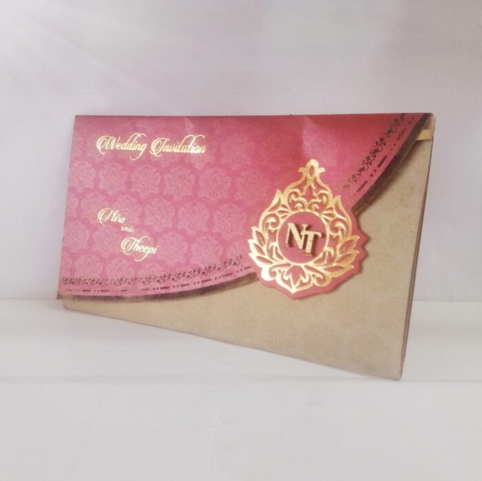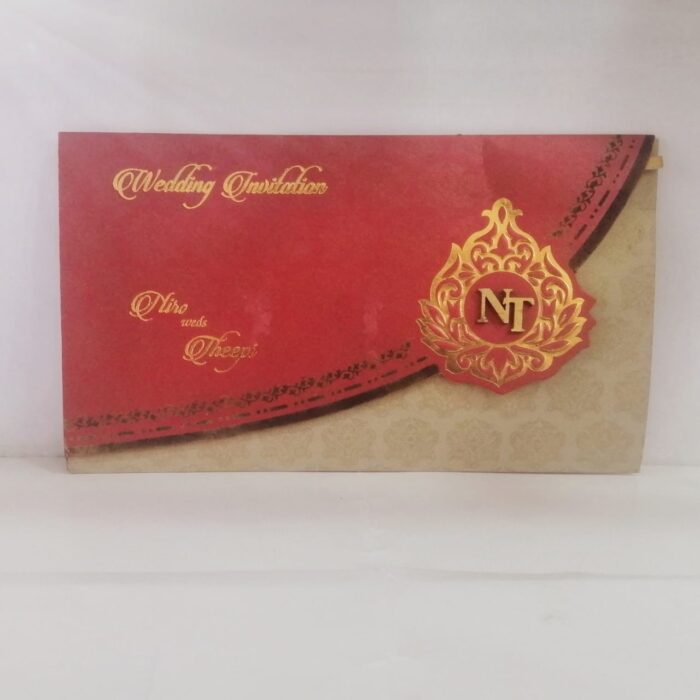Maroon wedding invitation is one of our elegant designs.This invitation card is made out of Maroon  textured metallic board with matching mailing envelope.Card has a  rich gold paisley foiled and couple initial logo(Please note, this logo can be changed to any symbol or ganesh as per your preference).Please choose one of the colour from our colours pallet (please check the image) for envelopes.120gsm shimmer paper.The card has two inserts with coordinated printed designs.