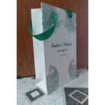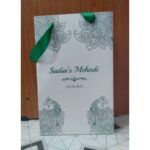 Mehndi bag – white and green colour gift bag is one of our beautiful design.These beautiful personalized gift bags are crafted out of very fine quality shimmery white metallic card stock,with green rope used as handles and with green ink design. Text and design printed on the bag is totally customizable. Hence the price reflects the luxury finishing.