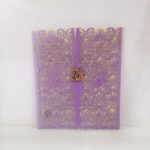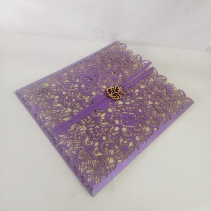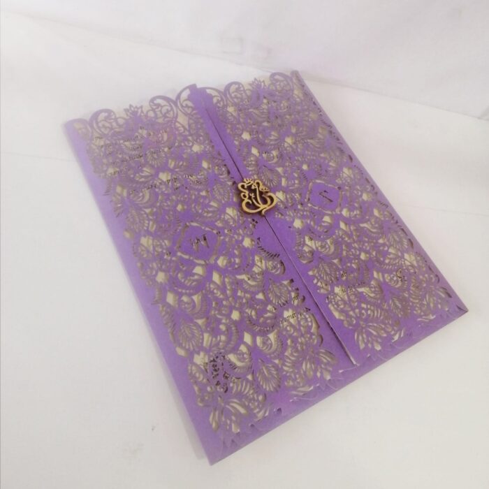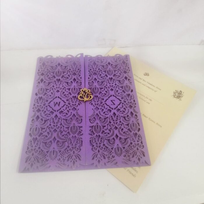 Laser cut is one of our elegant designs. This invitation card is made out of purple textured paperboard with matching paper mailing envelope.Card front has couple initial logo and two inserts with couple names.Please choose one of the colour from our colours pallet (please check the image) for envelopes. 120gsm shimmer paper.