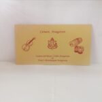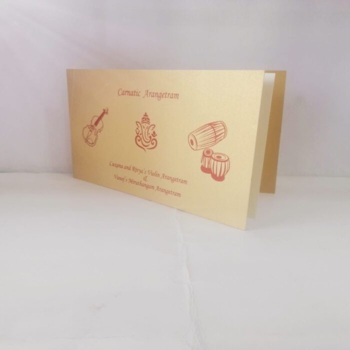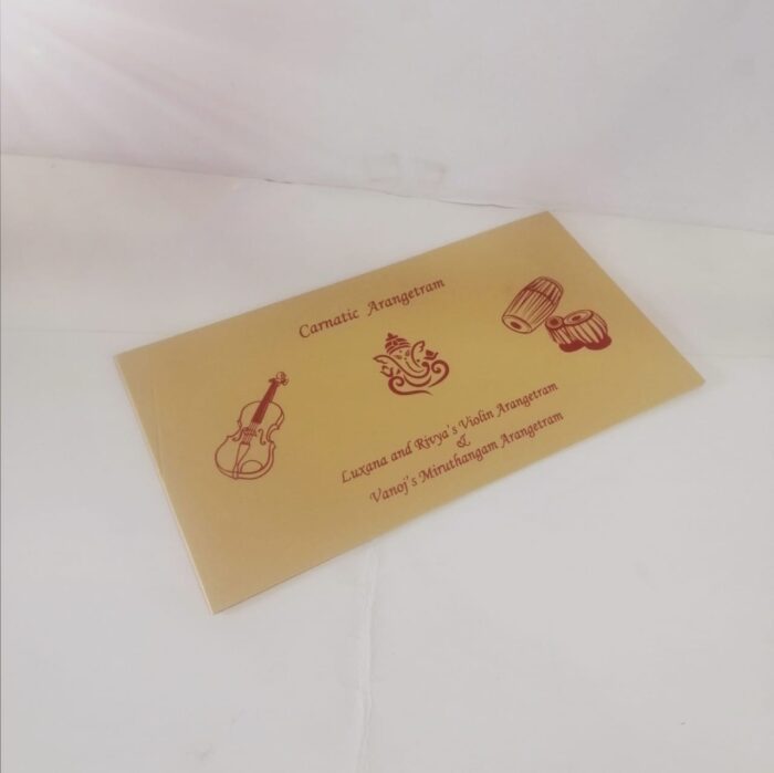 Gold invitation is one of our elegant designs.This invitation card is made out of Maroon textured paperboard with matching mailing envelope.Card has a ink print design. (Please note, this logo can be changed to any symbol or couple initial as per your preference). Please choose one of the colour from our colours pallet (please check the image) for envelopes. 120gsm shimmer paper. The card has inserts pasted in the middle of the card with coordinated printed designs.
