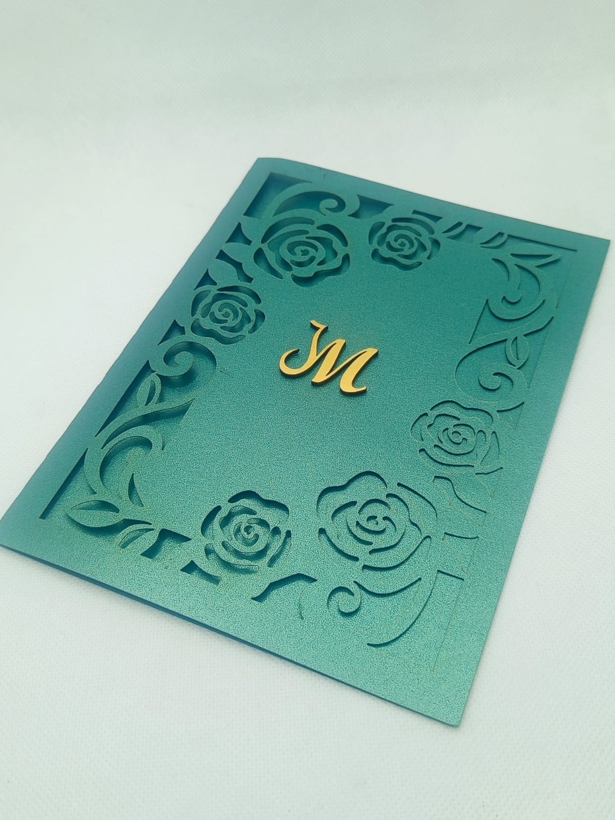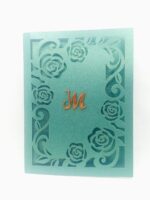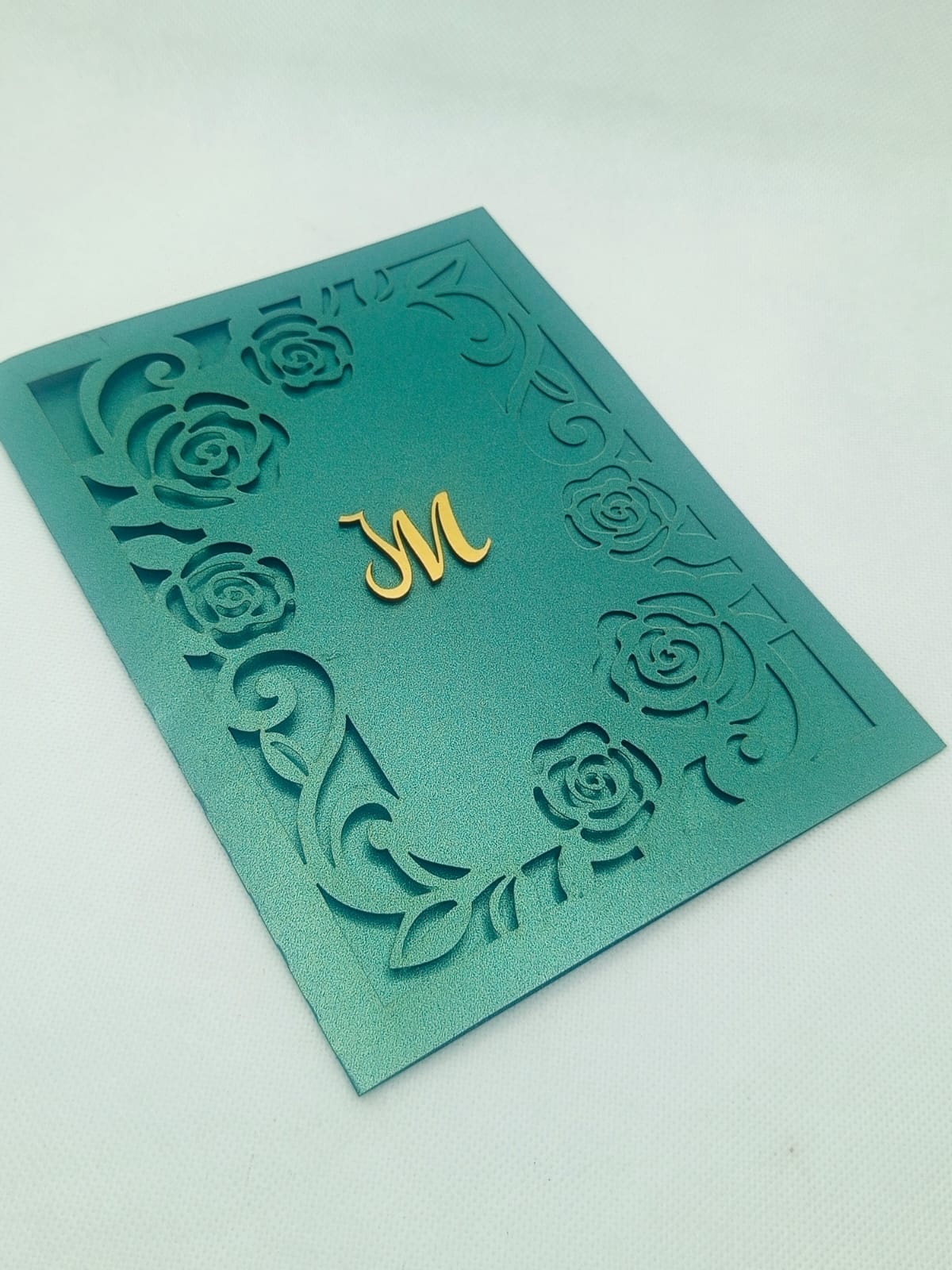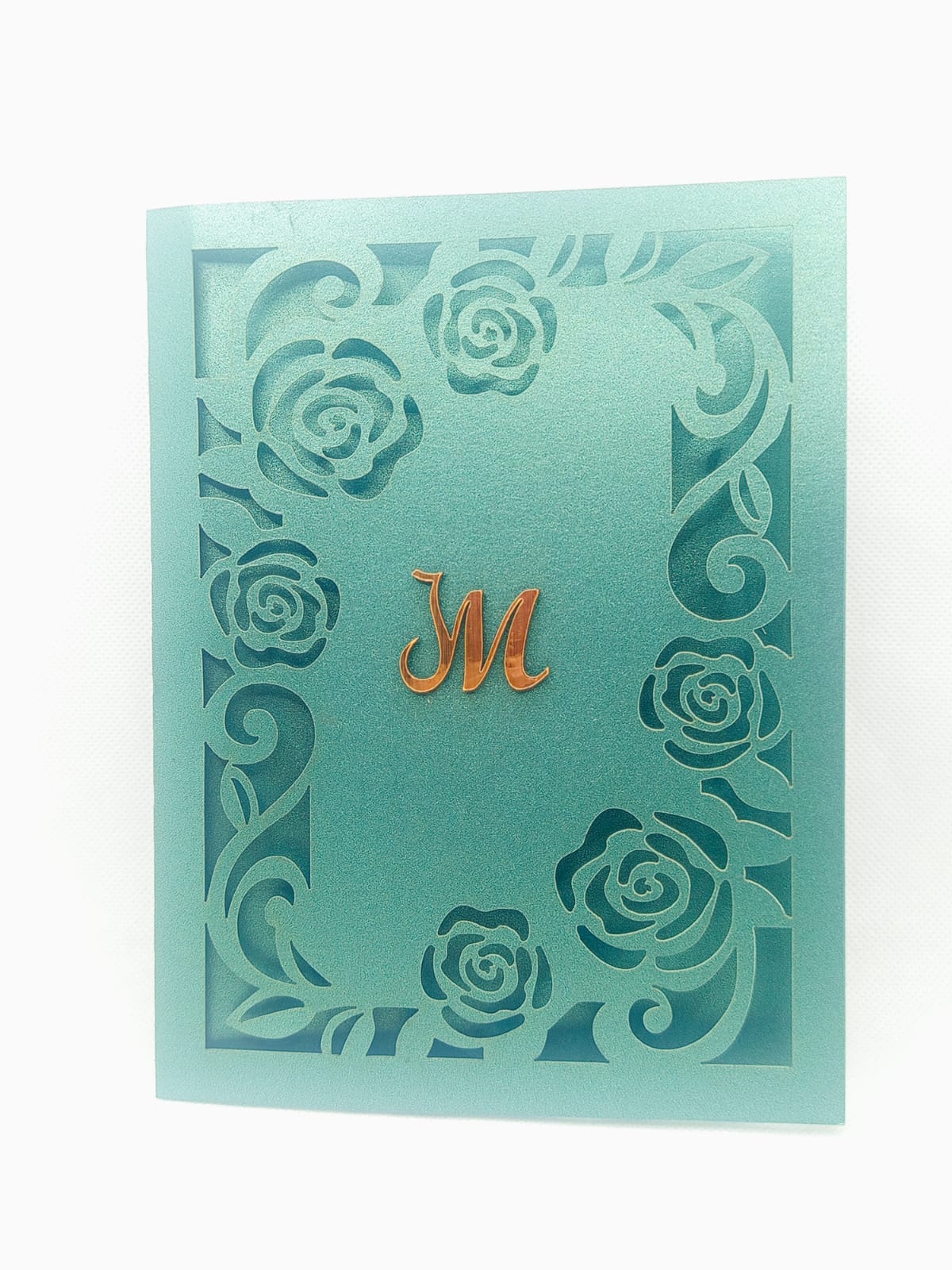 New rose laser cut wedding invitation is one of our elegant design . This invitation card is made out of green   textured shimmer board with matching mailing envelope. Card front has a rose laser cut. The card has two inserts with coordinated printed designs. The card front has coupel initial laser cut. (Please note, this logo can be changed to any symbol or couple initial as per your preference).