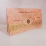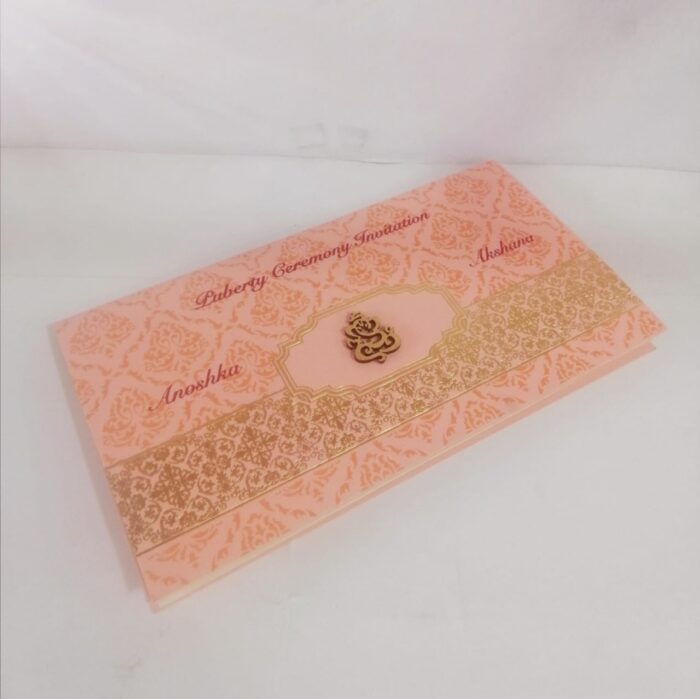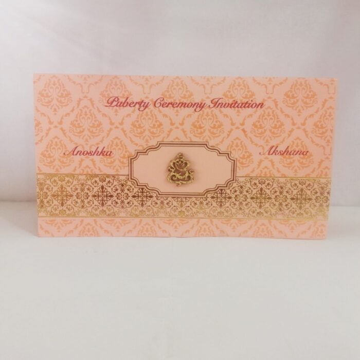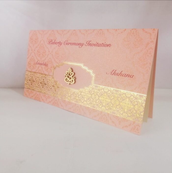 Orange and Gold Puberty Invitation is one of our elegant designs. This invitation card is made out of white textured metallic board with matching mailing envelope. Card front has a foiled design and 3D Ganesh (Please note, this logo can be changed to any symbol or couple initial as per your preference). Please choose one of the colours from our colour pallet (please check the image) for envelopes. 120gsm shimmer paper. The card has inserts with coordinated printed designs.