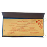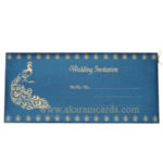 Peacock design wedding invitation is one of our elegant designs.This invitation card is made out of blue textured paperboard with matching mailing envelope.Card front has a rich Gold peacock design printed in ink and a 3D Ganesh logo(Please note, this logo can be changed to any symbol or couple initial as per your preference).Please choose one of the colour from our colours pallet(please check the image) for envelopes.120gsm shimmer paper.The card has two inserts with coordinated printed designs.