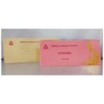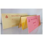 Saree ceremony peachy Pink is one of our elegant designs. This invitation card is made out of  Pink textured paperboard with matching mailing envelope.Card front has a rich Gold foiled with logo(Please note,this logo can be changed to any symbol or couple initial as per your preference).Please choose one of the colour from our colours pallet(please check the image)for envelopes.120gsm shimmer paper.The card has two inserts with coordinated printed designs.