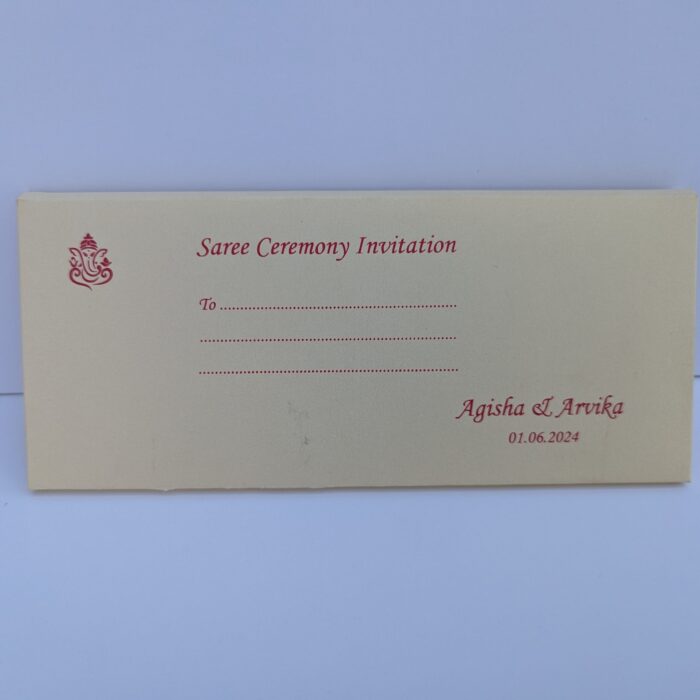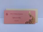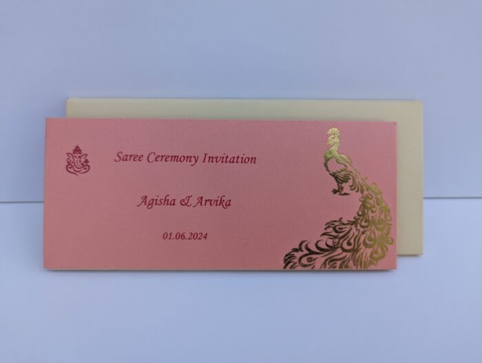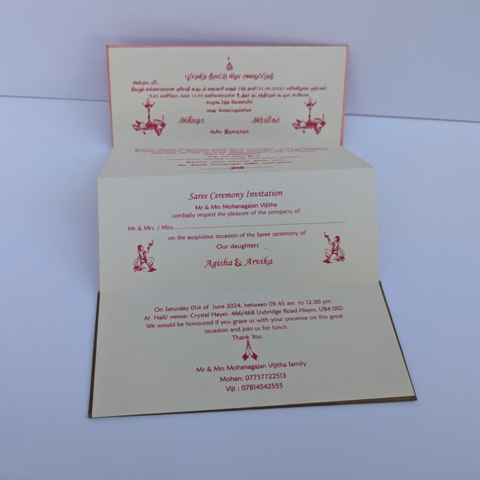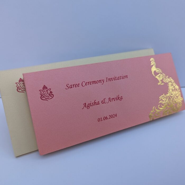 Pink with Cream puberty ceremony – Invitations is one of our elegant designs. This invitation card is made out of Pink textured paperboard with matching mailing envelope.Card front has a rich Gold foiled with Logo(Please note,this logo can be changed to any symbol or couple initial as per your preference).Please choose one of the colour from our colours pallet(please check the image)for envelopes.120gsm shimmer paper.The card has two inserts with coordinated printed designs.