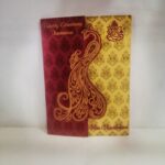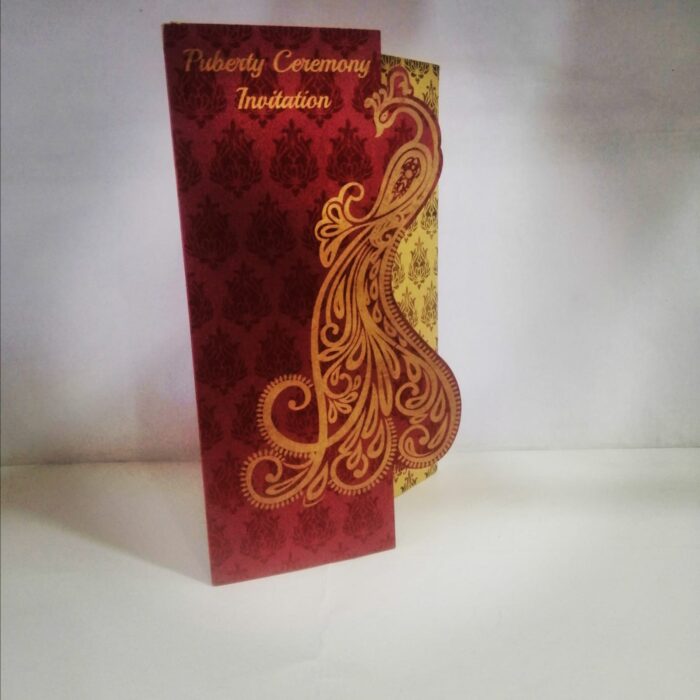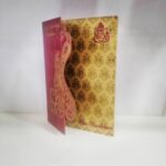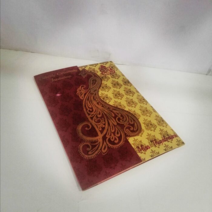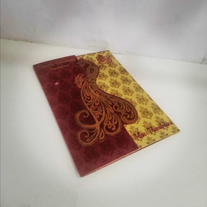 Purple and golden peacock wedding invitation is one of our elegant designs. This invitation card is made out of  Purple textured paperboard with matching mailing envelope.Card has a peacock design and watermark design on it’s background.The card has two inserts with coordinated printed designs.Please choose one of the colour from our colours pallet (please check the image) for envelopes. 120gsm shimmer paper. The card comes with two inserts with co-ordinated print.