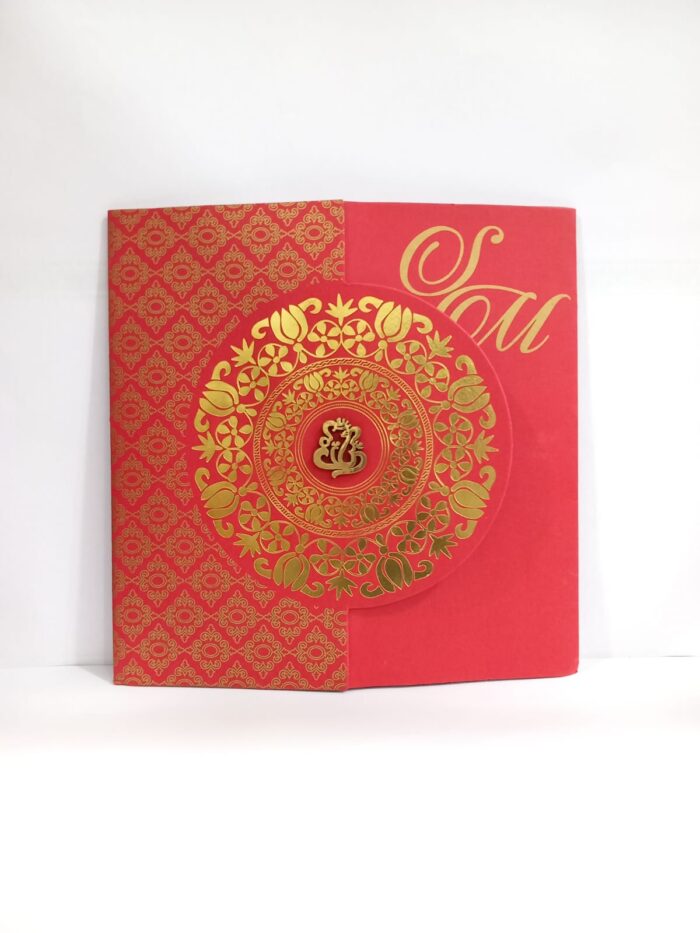 Red Mandala Design Invitation Card is very eye catching. This invitation card is made out of Red textured paperboard with matching mailing envelope.Card front has a gold Foil Mandala design.(Please note, this logo can be changed to any symbol or couple initial as per your preference).Please choose one of the colour from our colours pallet(please check the image)for envelopes.120gsm shimmer paper.The card has two inserts with coordinated printed designs.