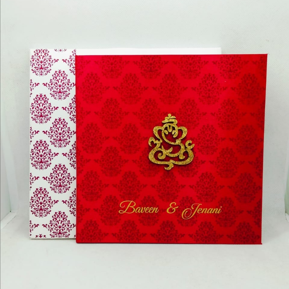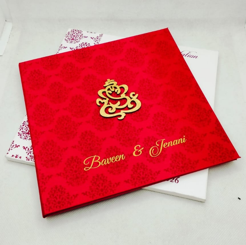 Red wedding invitation is one of our elegant design. This invitation card is made out of red textured board & satin material with matching white box folding envelope. Card has water mark design printed ana ganesh logo(Please note, this logo can be changed to any symbol or couple initial as per your preference). The card has two inserts with coordinated printed design.
