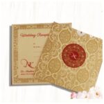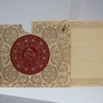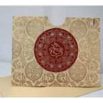 Ring binder pocket pouch wedding invitation is one of our elegant designs.This invitation card is made out of cream textured metallic board with matching mailing envelope. Card front has a watermark design in Gold and Maroon design foil printed with Ganesh logo foil printing(Please note,this logo can be changed to any symbol or couple initial as per your preference).Please choose one of the colour from our colours pallet(please check the image)for envelopes. 120gsm shimmer paper.The card has two inserts with coordinated printed designs.