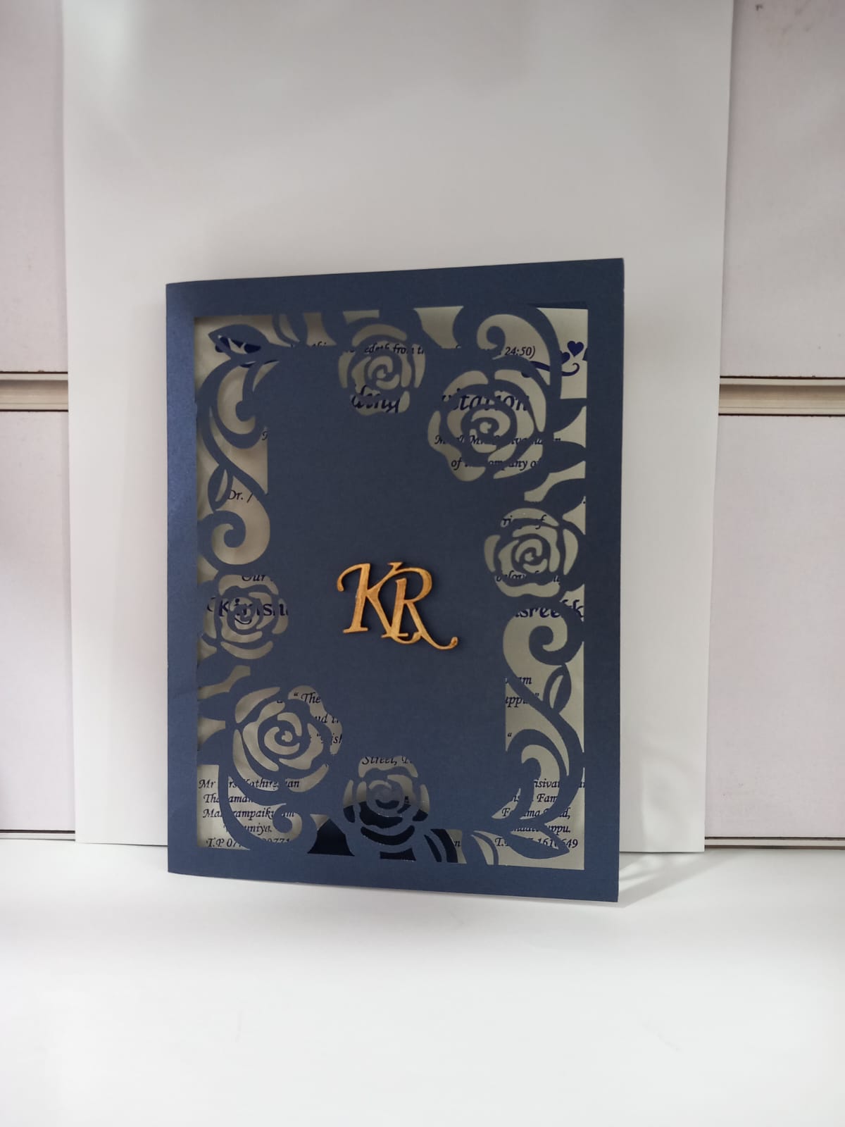 Rose laser cut wedding invitation is one of our elegant designs.This invitation card is made out of Blue textured paperboard with matching mailing envelope.Card front has a couple laser cut.The card has inserts with coordinated printed designs.(Please note,this logo can be changed to any symbol or couple initial as per your preference).Please choose one of the colour from our colours pallet(please check the image)for envelopes.120gsm shimmer paper.The card has two inserts with coordinated printed designs.