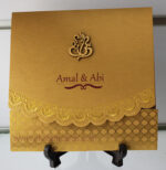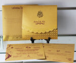 Scallop Gold wedding invitation  is one of our elegant designs.This invitation card is made out of Gold textured board with matching mailing envelope.Card front has a scallop design foiled and cover with scallop design foiled with logo(Please note,this logo can be changed to any symbol or couple initial as per your preference).Please choose one of the colour from our colours pallet(please check the image) for envelopes.120gsm shimmer paper.The card has two inserts with coordinated printed designs.