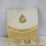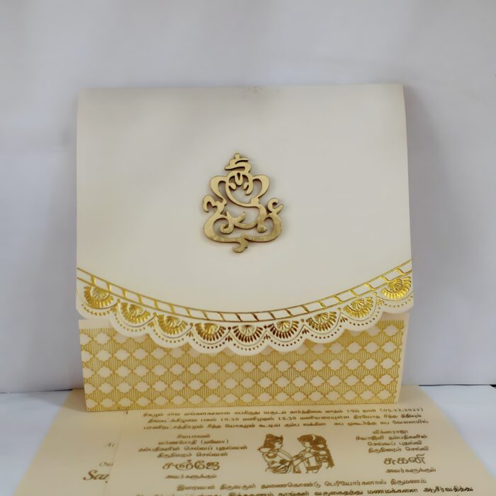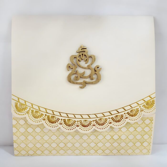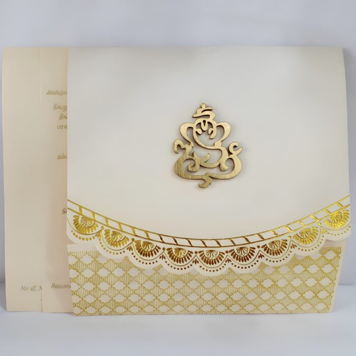 Scallop white wedding invitation is one of our elegant designs.This invitation card is made out of white textured board with matching mailing envelope.Card front has a scallop design foiled and cover with scallop design foiled with logo(Please note,this logo can be changed to any symbol or couple initial as per your preference).Please choose one of the colour from our colours pallet(please check the image) for envelopes.120gsm shimmer paper.The card has two inserts with coordinated printed designs.