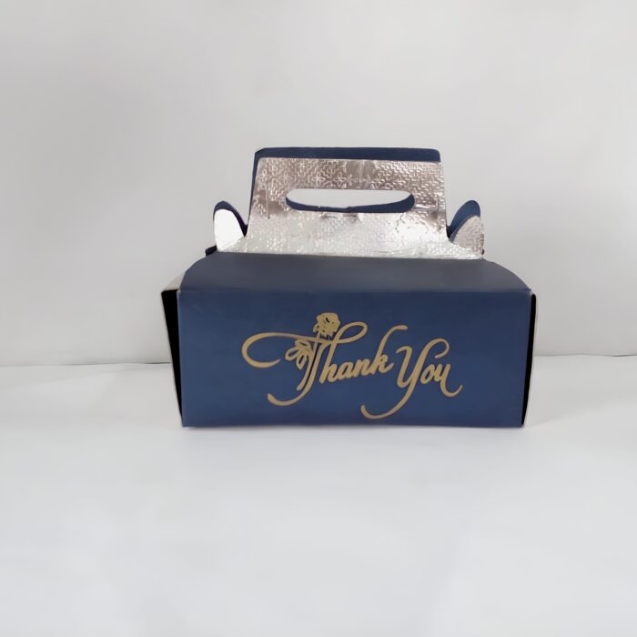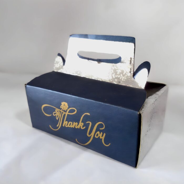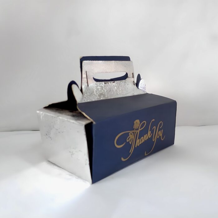 Suitcase model blue cake box.This cake box is made out of Blue metallic board.Cake box front has a Gold ink screen printing.