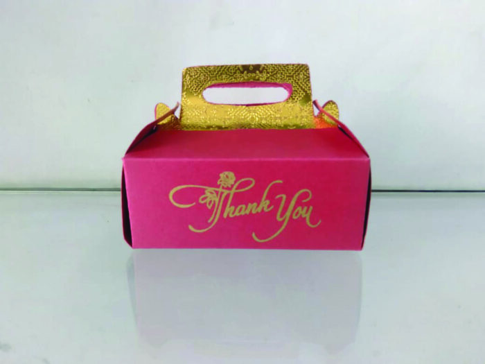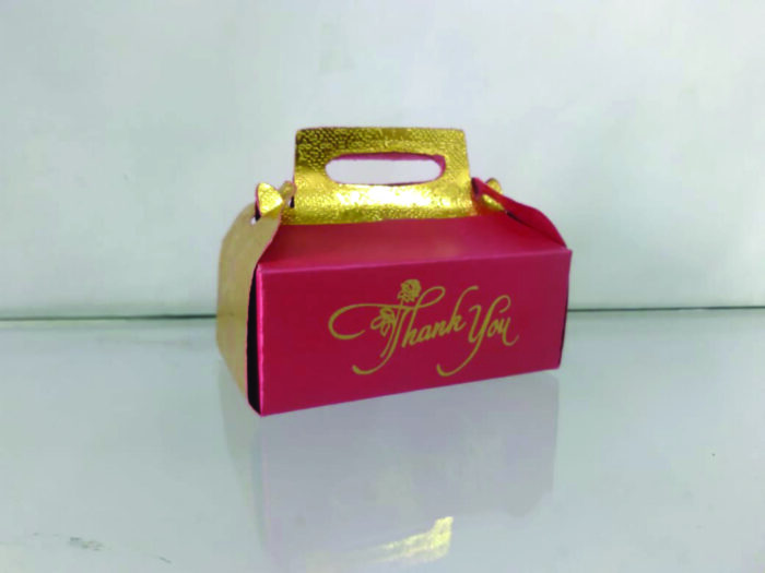 Suitcase model Red with Gold cake box.This cake box is made out of Red metallic board.Cake box front has a Gold ink screen printing.