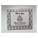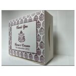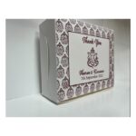 White and Maroon flower design snack box is one of the cutest that we produce.This snack box is made out of off White matt board.Snack box top has a design and text in Maroon ink.