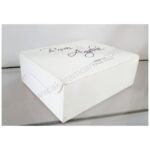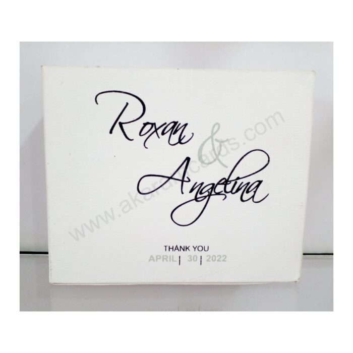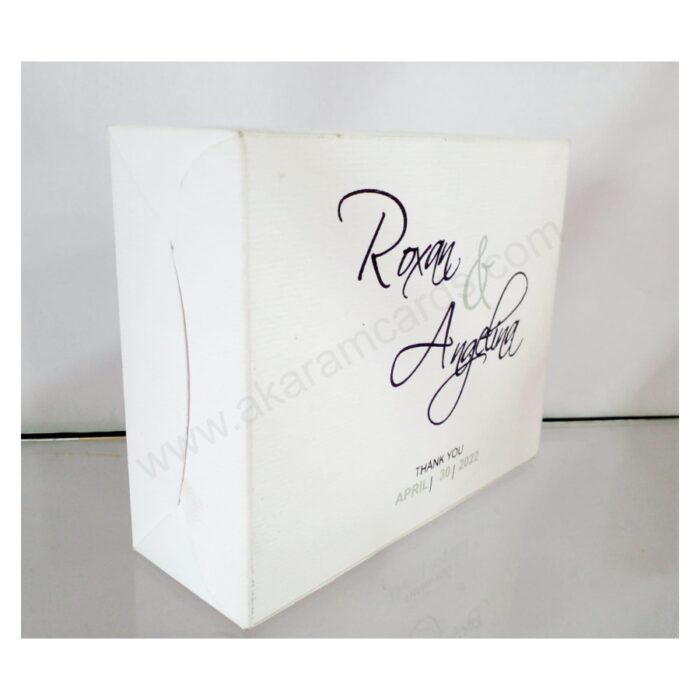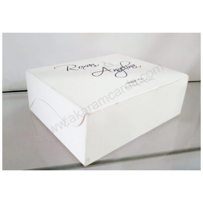White color snack box is one of the cutest that we produce. This snack box is made out of off white matt paperboard. Snack box top has a design and couple name printed in Black ink.