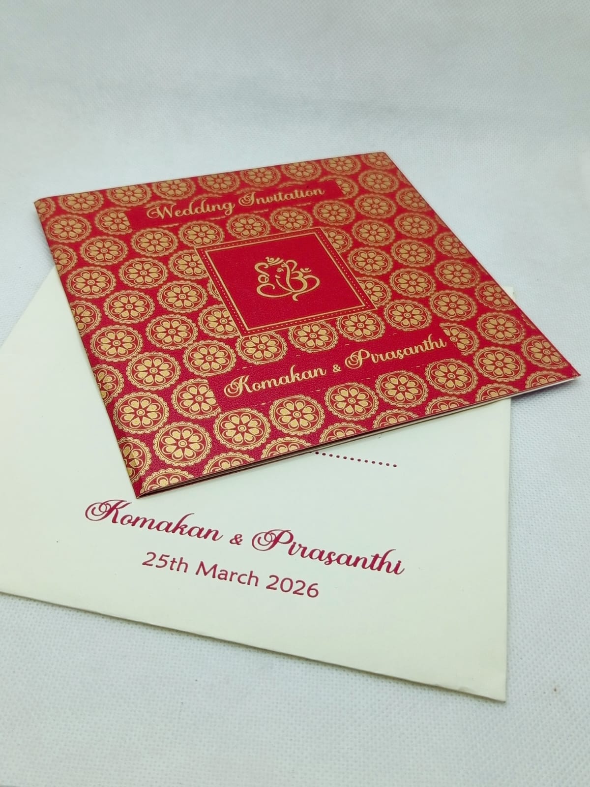 Amazing red wedding invitation is one of our elegant design. This invitation card is made red textured metallic board with matching paper envelope. Card front has a gold ink print. The card has inserts with coordinated printed design.