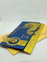 Blue and gold hindu wedding invitation is one of our elegant design. This invitation card is made out of blue textured metallic board with matching shimmer envelope. Card front has a foiling design and laser cut ganesh logo (Please note, this logo can be changed to any symbol or couple initial as per your preference). The card has two inserts with coordinated printed designs.