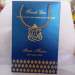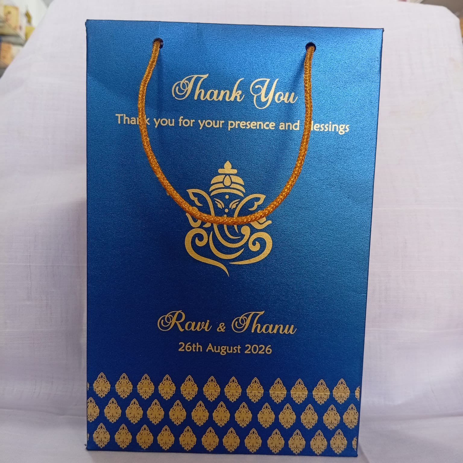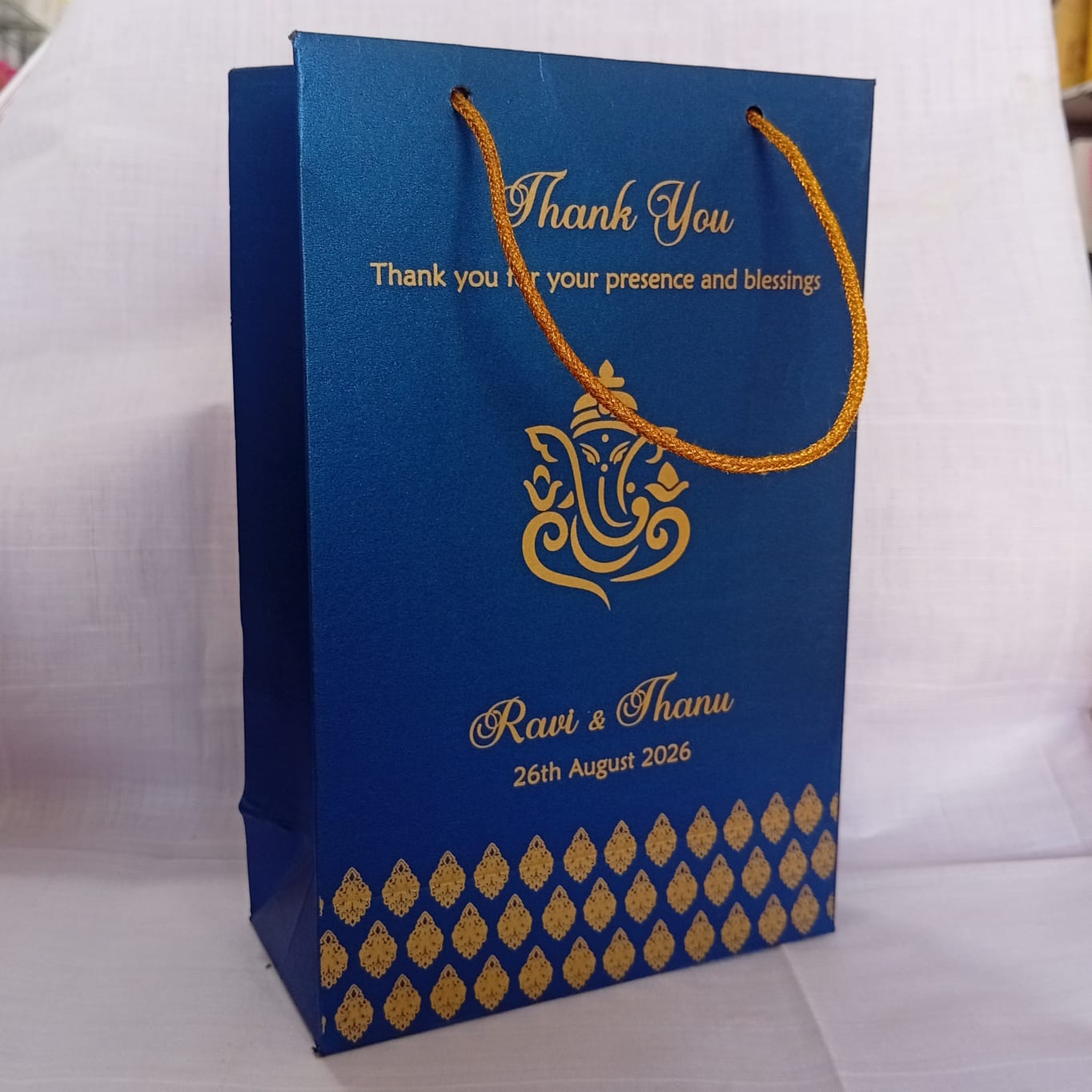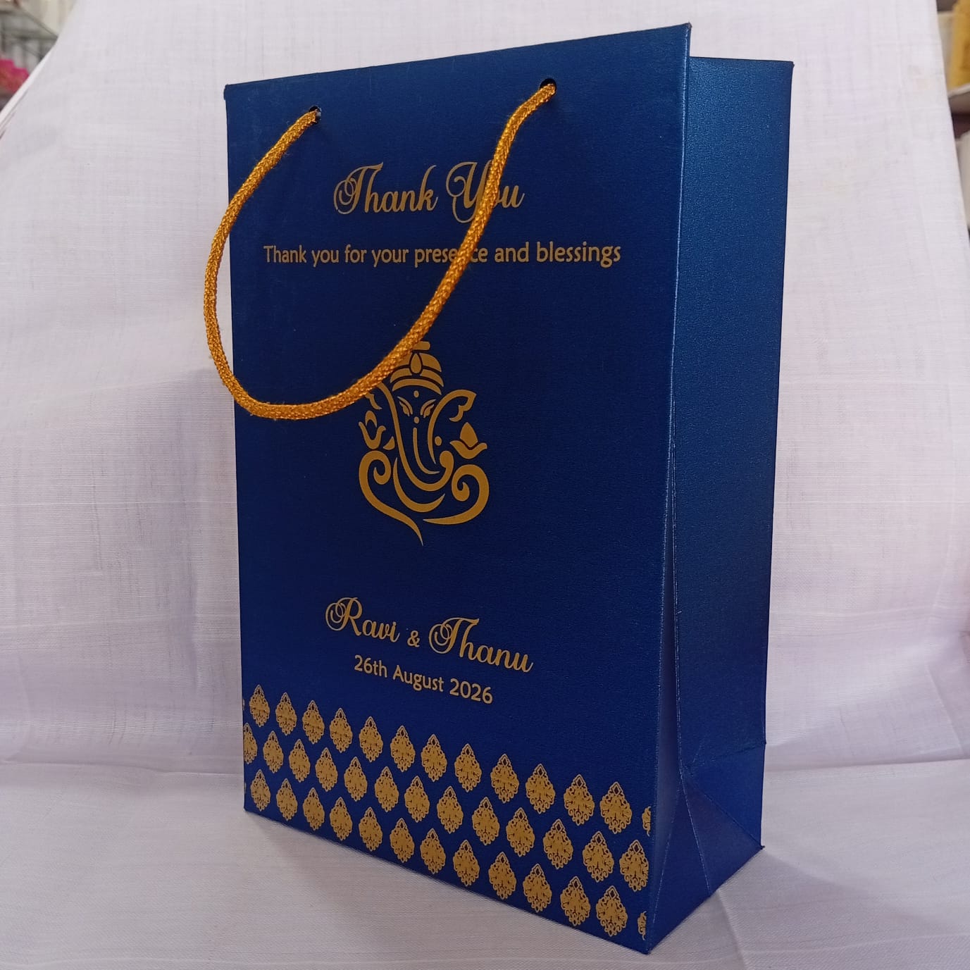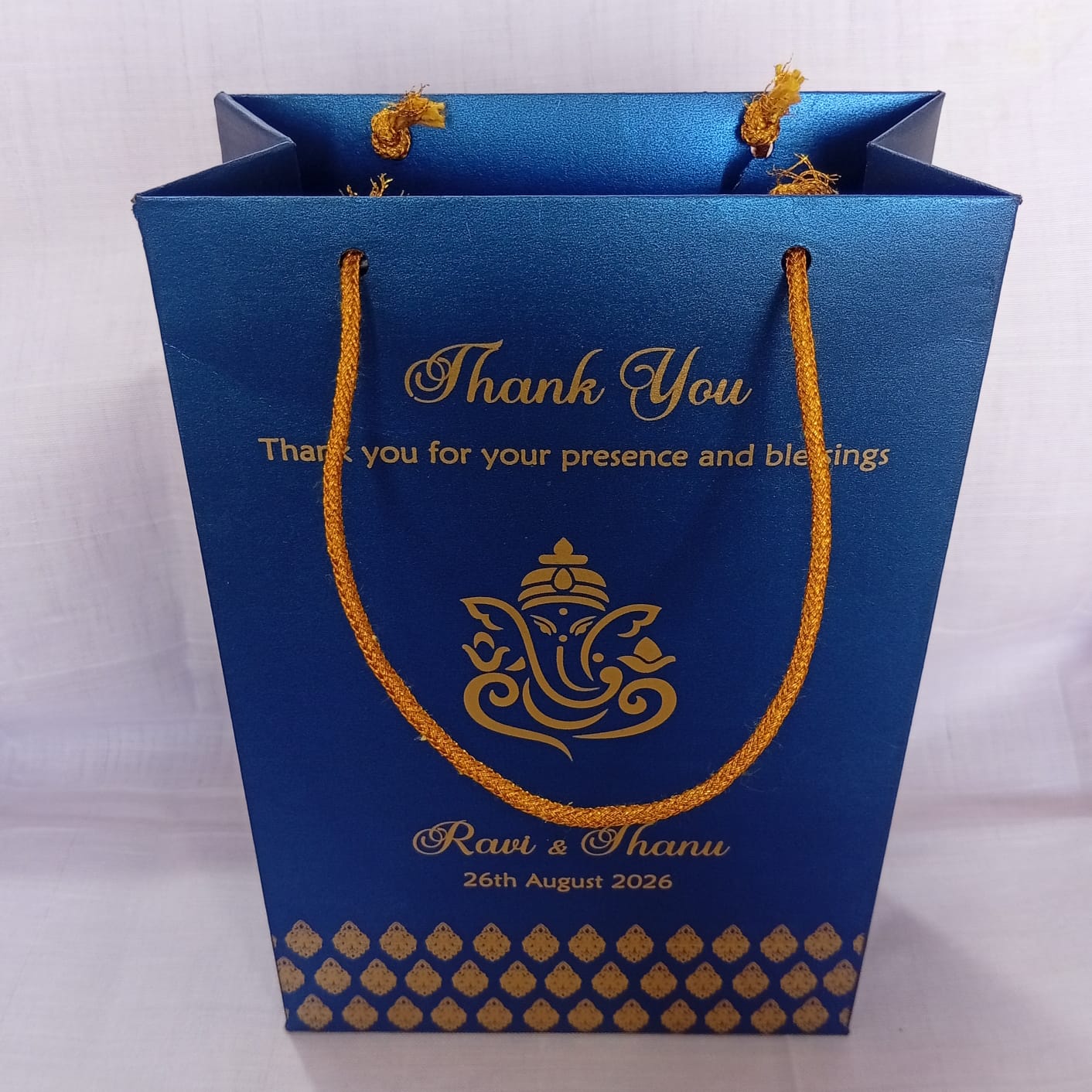 Blue colour gift bag is one of our beautiful design. These beautiful personalized gift bags are crafted out of very fine quality blue metallic borad, with gold rope used as handles. The printing on this bag is gold ink.
