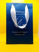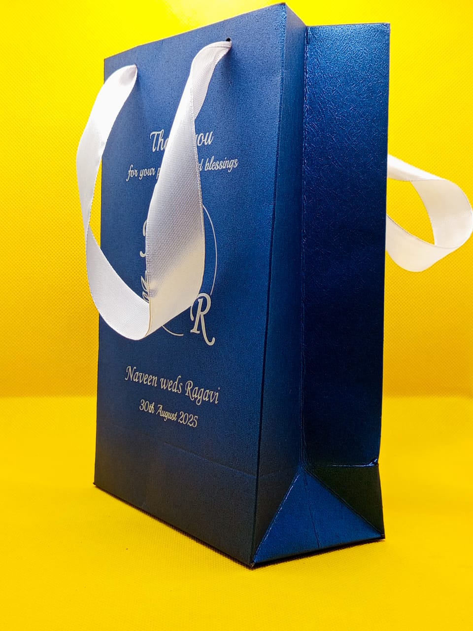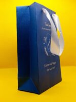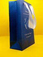 Blue colour bag – Blue colour bag is one of our beautiful design. These beautiful personalized gift bags are crafted out of very fine quality blue metallic card stock,with white ribbon used as handles. Text and design printed on the bag is totally customizable. The printing on this bag is white ink. Hence the price reflects the luxury finishing.