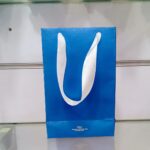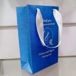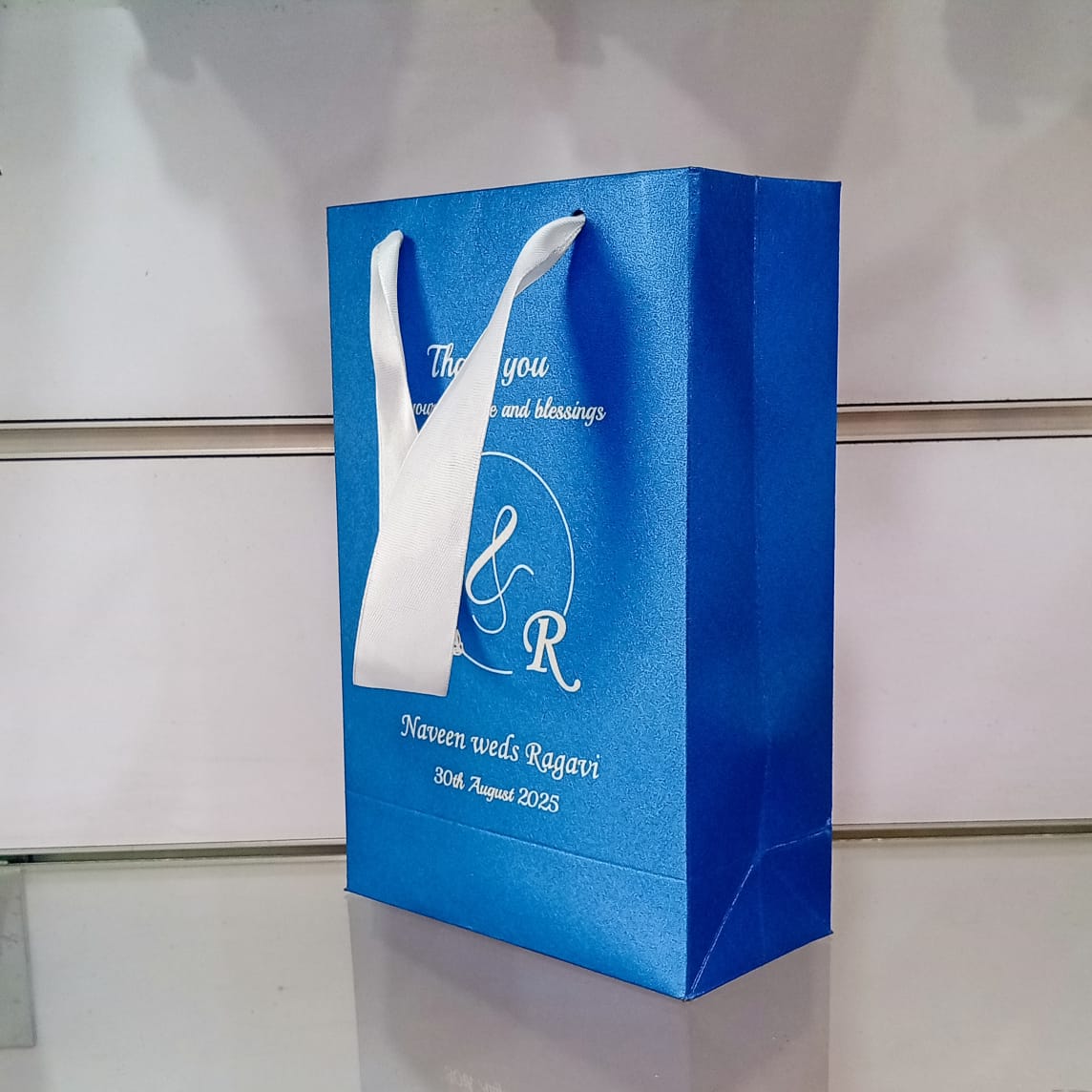 Blue colour new gift bag is one of our beautiful design. These beautiful personalized gift bags are crafted out of very fine quality blue metallic card stock, with white ribbon used as handles. The printing on this bag is white ink.